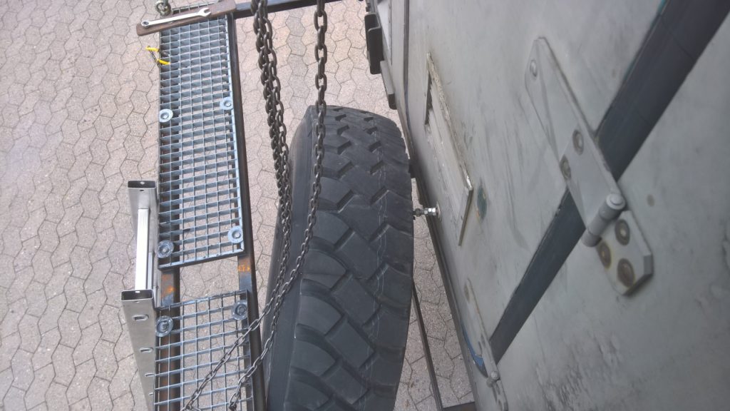 Normalerweise hängt das Ersatzrad beim DAF T244 rechts auf der Beifahrerseite schräg unter dem LKW. Dort sind bei mir Staukästen. Bei mir hängt das Ersatzrad dagegen hinten an der Kabine und wird mit einem Ketten Seilzug runtergelassen.