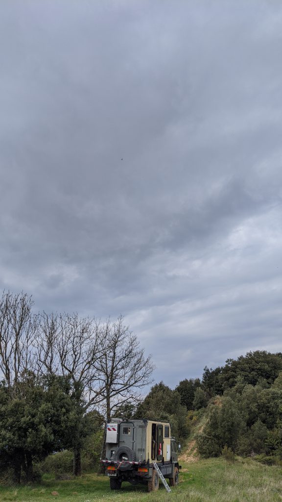 Für die (zum Schluss vier) Solarzellen – mehr Solar geht nicht – hat mir ein befreundeter Automechaniker dann vier Rahmen geschweisst und diese Konstruktion wurde mit Sika Flex aufs Dach geklebt. Sika Flex, auch so ein Teufelszeug. Man schmiert es sich für alle Zeiten in die Klamotten, es geht tagelang nicht von den Fingern ab, aber die Konstruktion pappt bis heute perfekt auf dem Dach, egal ob Sommer oder Winter.