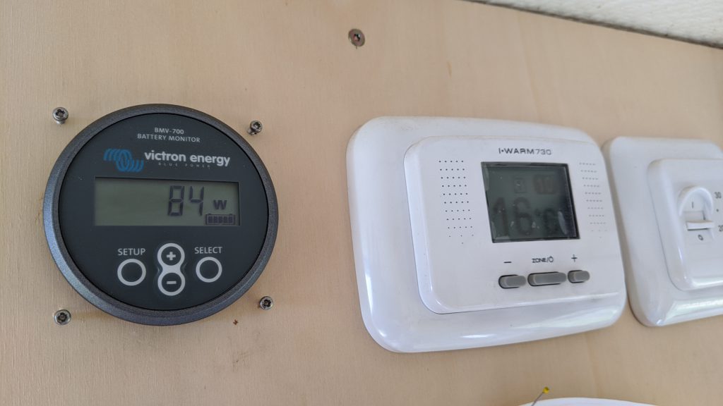 Selbst bei diffusem Licht sind es daher noch 40 bis 100 Watt, die von den vier Solarzellen insgesamt ankommen. Eine Solarzellen liefert dann 50 Volt, die am MPPT 75 anliegen. Es fliesst dann natürlich nur sehr wenig Strom. Reicht aber, um die Batterien halbwegs bei Laune zu halten. Bei Regen und dick wolkenverhangenem Himmel wird jedoch kein Strom erzeugt. Bei wolkenlosem Himmel und schräg auf die flach montierten Panels scheinender Sonne sind es um die 500 Watt, über die man sich freuen kann. Ein paar sonnenlose Tage übersteht die Anlage daher, wenn keine starken Verbraucher wie die Fussbodenheizung (Nachts) dazu kommen.