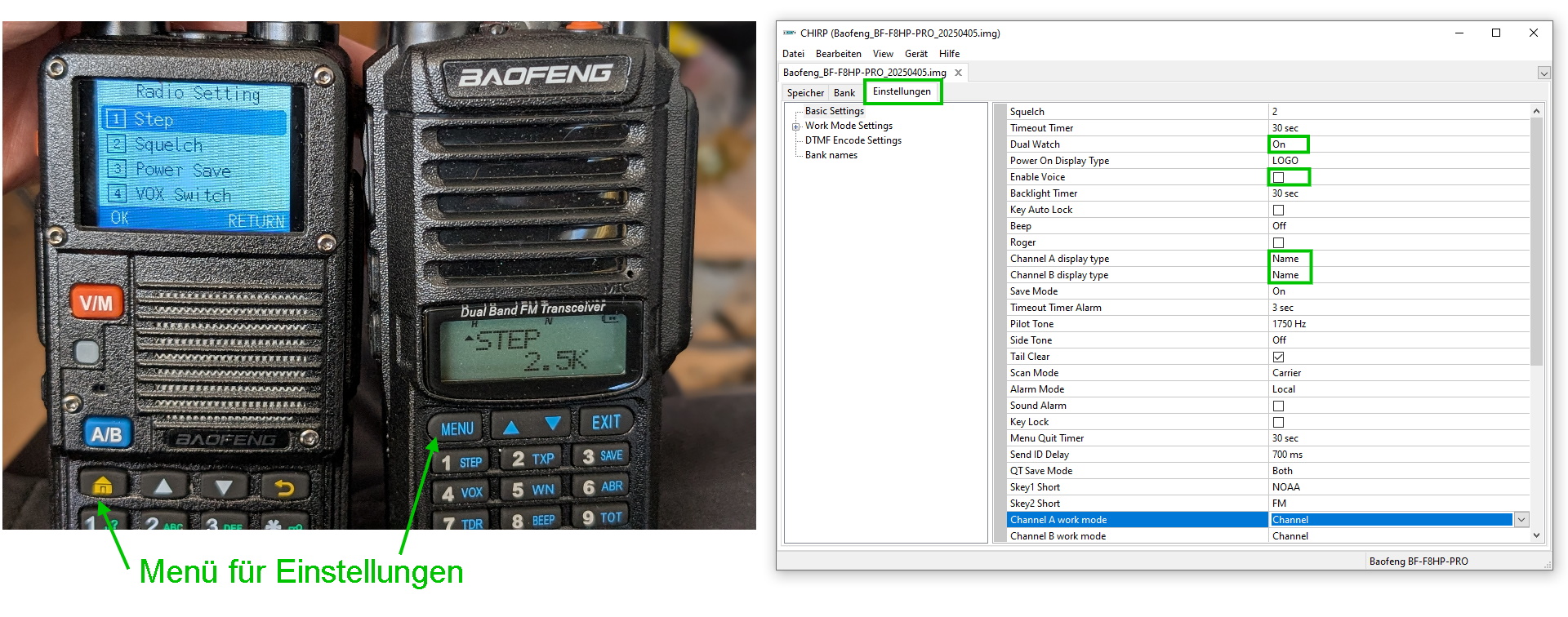 Für Unterwegs oder in Notfällen super, aber einfacher geht es am Computer. Beim Auslesen der programmierten Kanäle importiert CHIRP gleichzeitig die Einstellungen. Die Optionen am Computer ändern und zurück schreiben ist viel übersichtlicher und komfortabler.