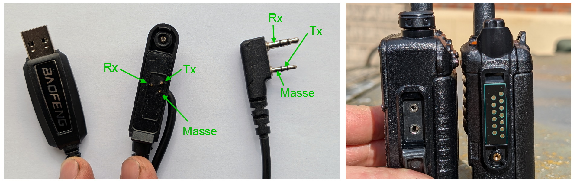 Um das Funkgerät für Einstellungen mit dem PC zu verbinden ist ein ca 10€ teures Programmierkabel notwendig. Für Baofeng gibt es zwei unterschiedliche: eins hat einen flachen Stecker mit drei Kontakten. Ein zweites hat einen doppelten Stecker mit 3,5mm / 2,5mm Klinke, der in den Anschluss vom Mikro / Ohrhörer passt. Diese Buchsen funktionieren sowohl für Audio als auch als serielle Schnittstelle.
