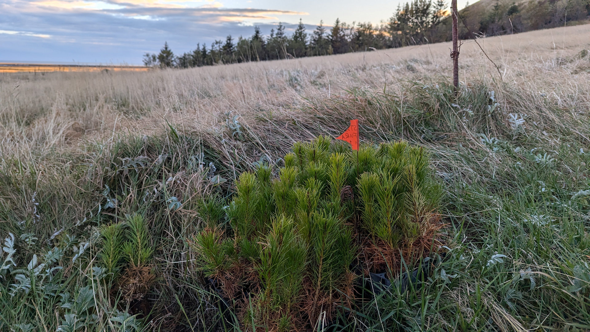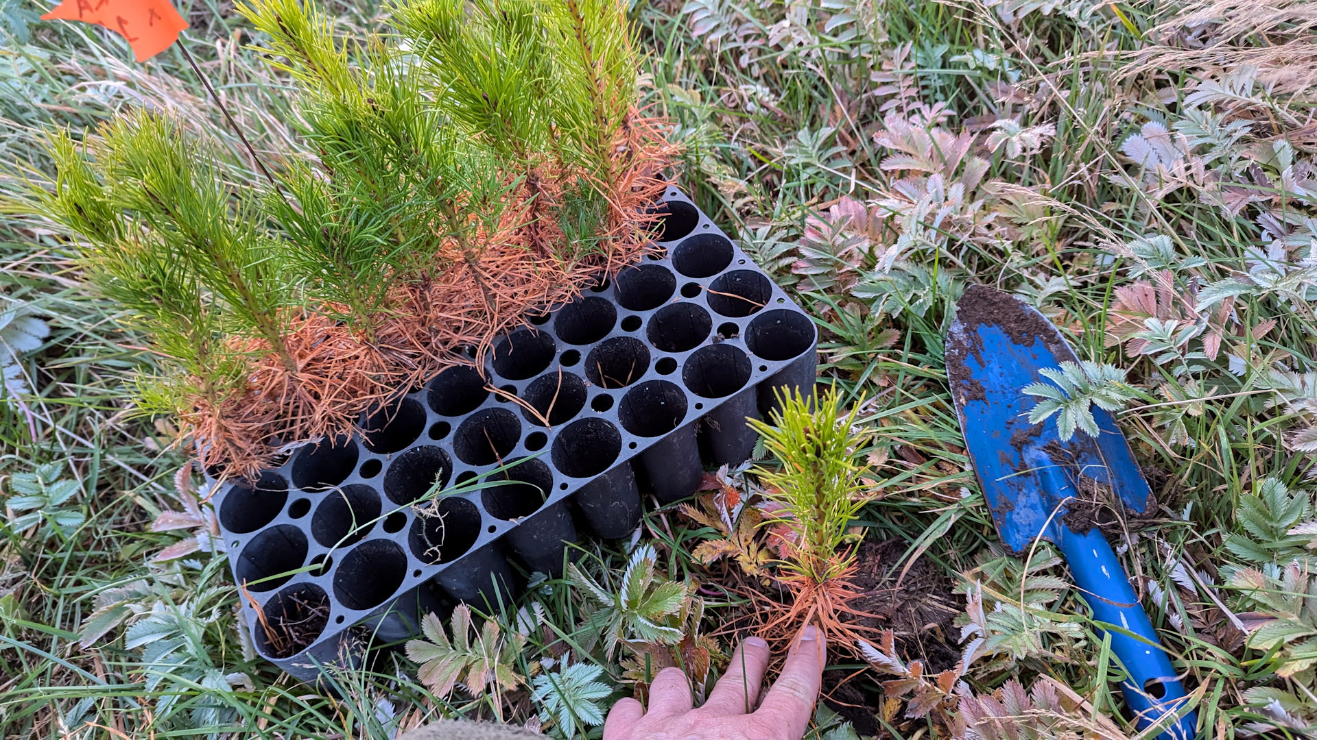 Die Sämlinge sahen tatsächlich so aus, als wollten sie ganz gern noch etwas weiter wachsen. Sie hatten in ihrem Plastikgefängnis gute Wurzeln ausgebildet. Ich hab da überall quer durch die Gegend mit einer blauen Sandschaufel Löcher gemacht und die kleinen Bäumchen wild verteilt. Rund um die verfallene Scheune, den Weg entlang und den Hang hoch.