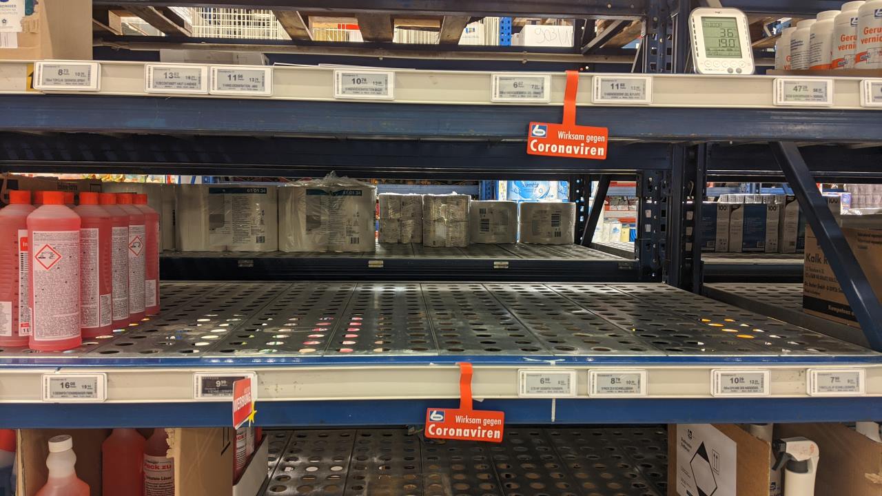 Leer geräumtes Regal im Metro Supermarkt. Ein rotes Schild weist unnötigerweise darauf hin, dass das ausverkaufte Reinigungsmittel wirksam gegen Coronaviren ist.