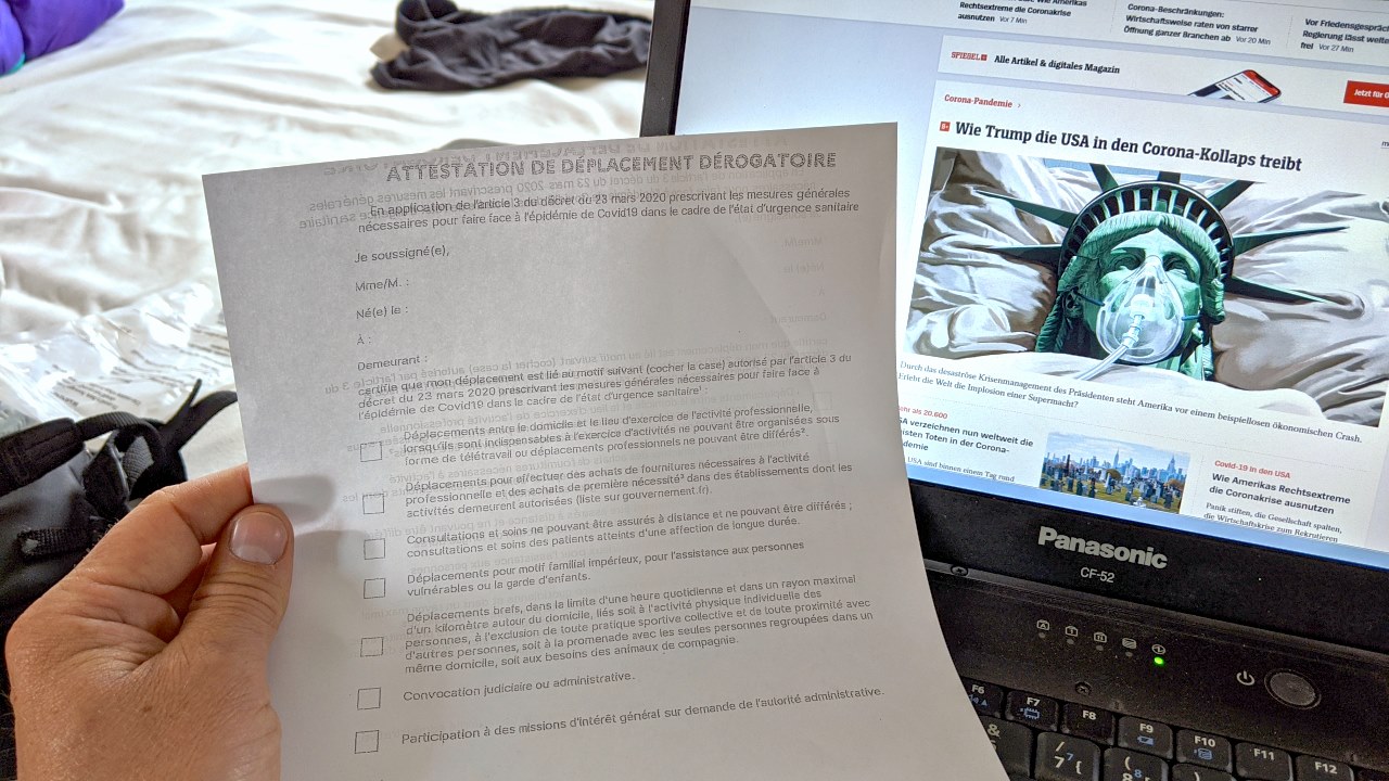 12.04.2020: Unterwegs in Frankreich. Die Regierung erlaubt Reisen nur noch aus guten Gründen. Eine geplante Rückreise nach Deutschland oder Supermarktbesuche sind einer dieser beiden. Vor jedem Fahrtantritt gilt es daher, die Attestation de Deplacement Derogatoire auszufüllen. Ich grabe mein Schulfranzösisch aus. In Donald Trumps Amerika wird gegen Corona dagegen praktisch nichts unternommen.