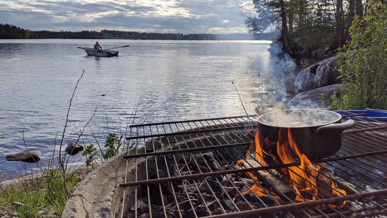 Ein Topf mit Kartoffeln kocht in Schweden auf einem kleinen offenen Feuer an einem See. Auf dem See fährt ein 15 jähriger Junge Ruderboot.