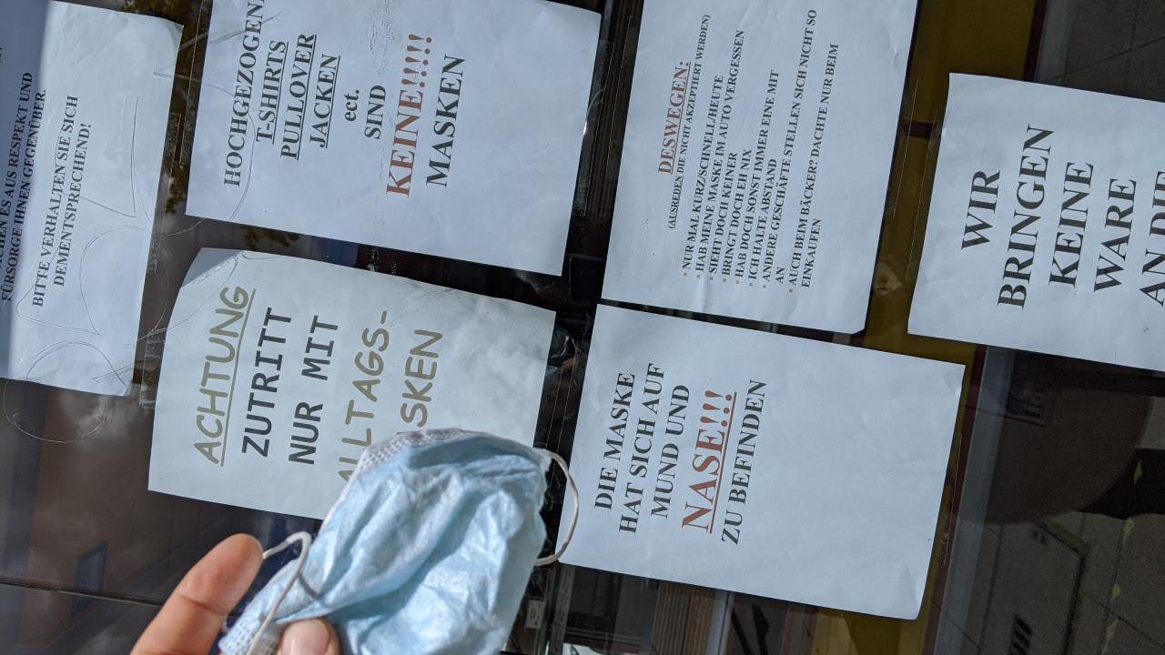 Sommer 2020, Schaufenster beim Bäcker um die Ecke. Die Typen dort haben echt einen Knall. Maskenpflicht – verstehe ich. Aber hier hat sich eine ausgewachsene Corona Hysterie manifestiert. Seit dem schwinge ich mich aufs Fahrrad und fahre einen Bäcker weiter.