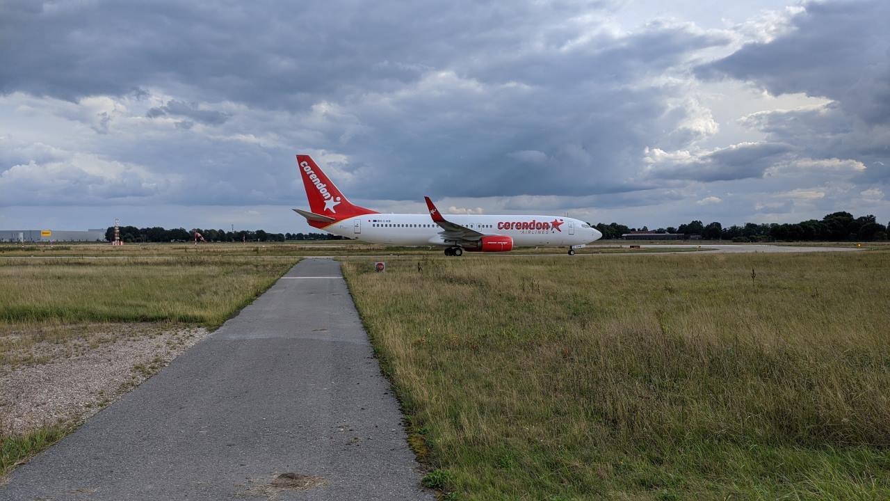 Ein grosses Flugzeug auf dem Flugfeld von Hannover Langenhagen. Es ist mit corendon beschriftet, was zunächst an Corona denken lässt