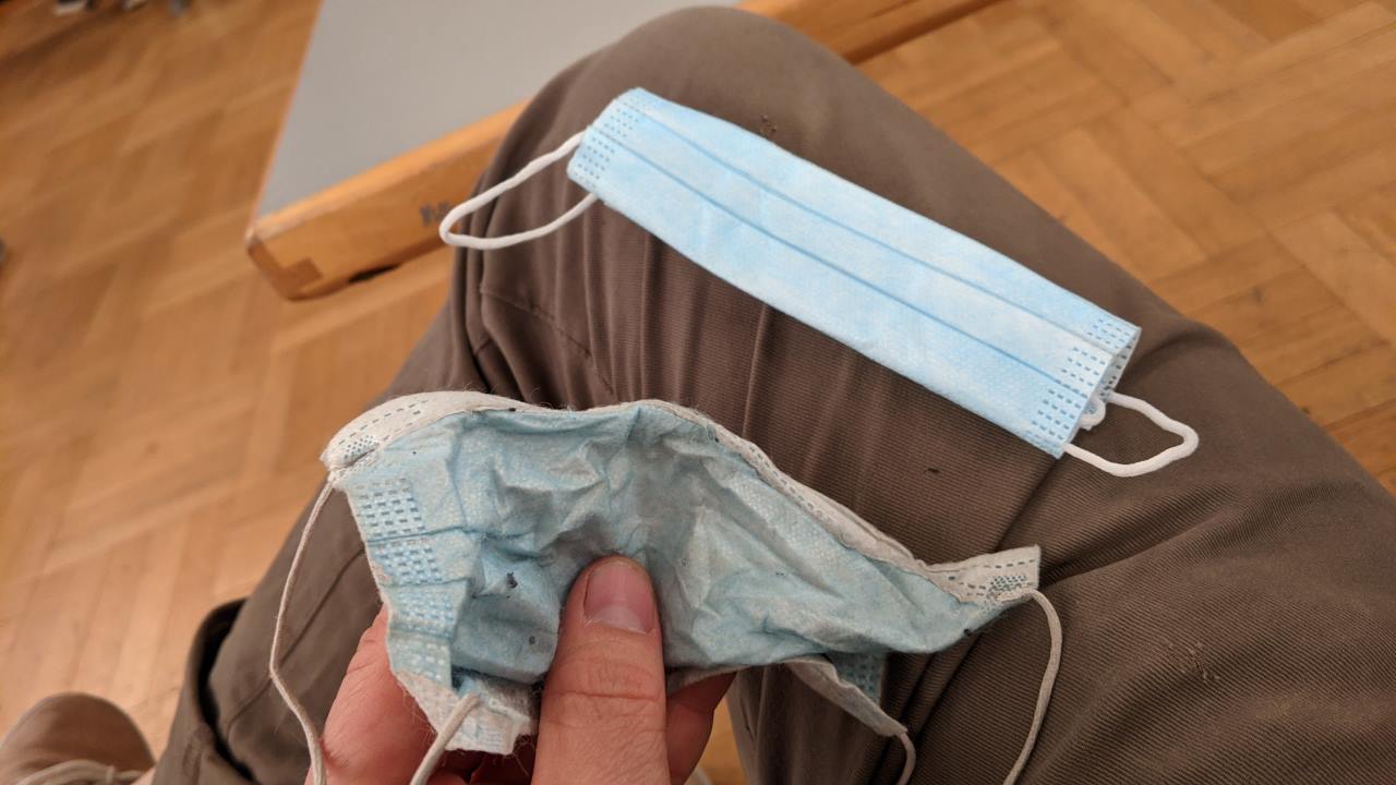 17.09.2020, Elternabend an der Schule meiner Teenager Kids. Natürlich mit Maskenzwang und meine ist inzwischen ziemlich abgenutzt. Aber draussen vor der Schule hat jemand eine praktisch neue weggeworfen, die ich vom Boden aufgehoben und eingesteckt habe.