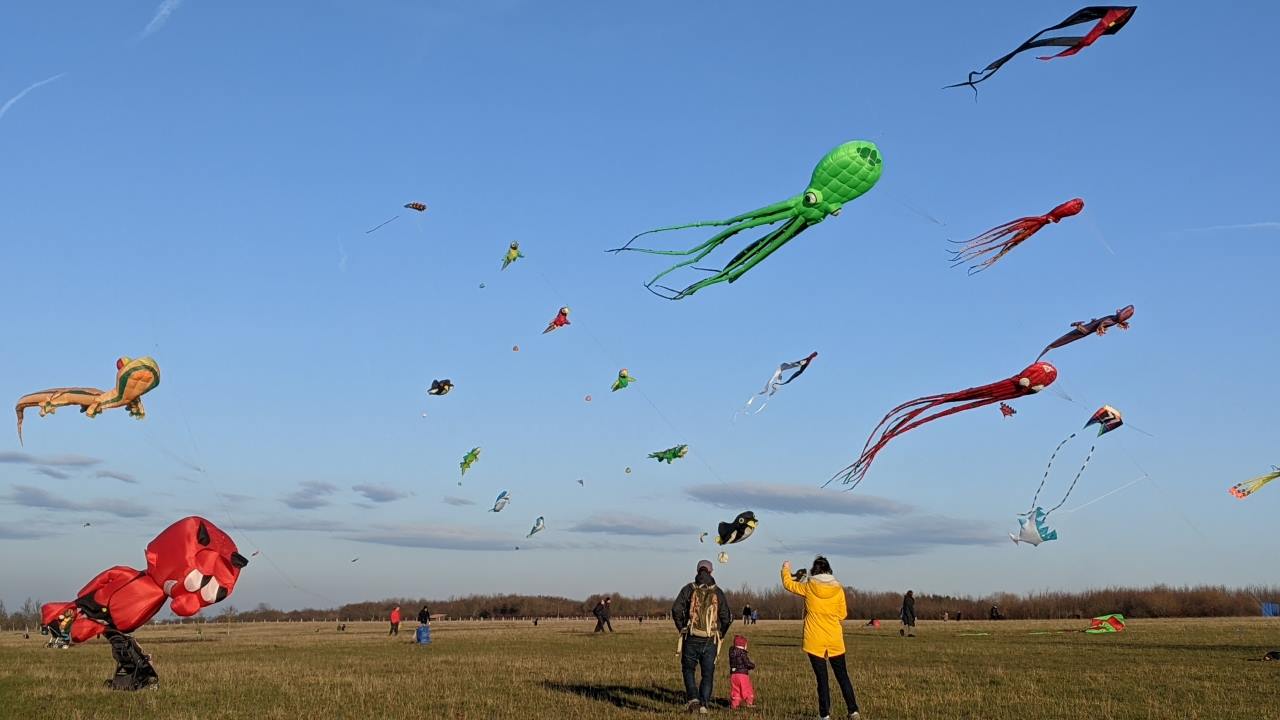 Drachen mit unterschiedlichen Farben flattern im Wind auf dem Kronsberg Hannover