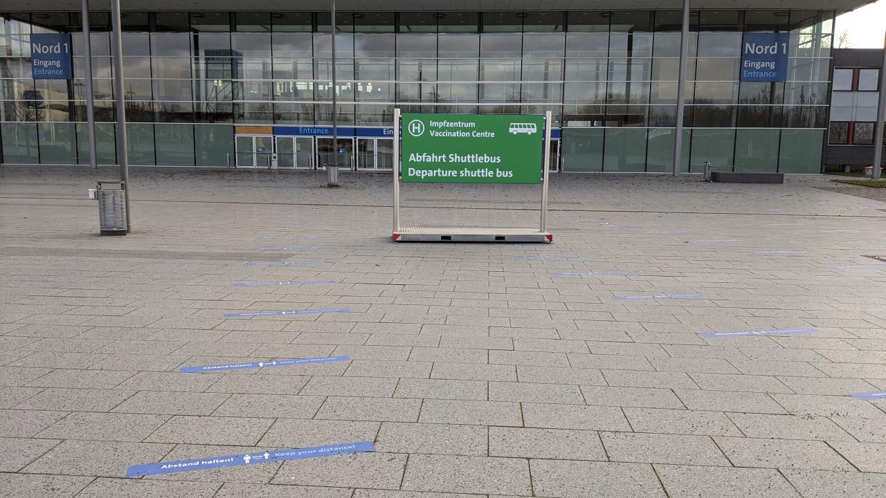 24.01.2021: ich kremple schon Mal die Ärmel hoch und halte beim Messegelände nach der Impfung Ausschau. Hier war ich vor zwei Wochen schon einmal. Gähnende Leere. Die einzige Veränderung: jemand hat das Schild um den Hinweis erweitert, dass kein Shuttle Verkehr statt findet.