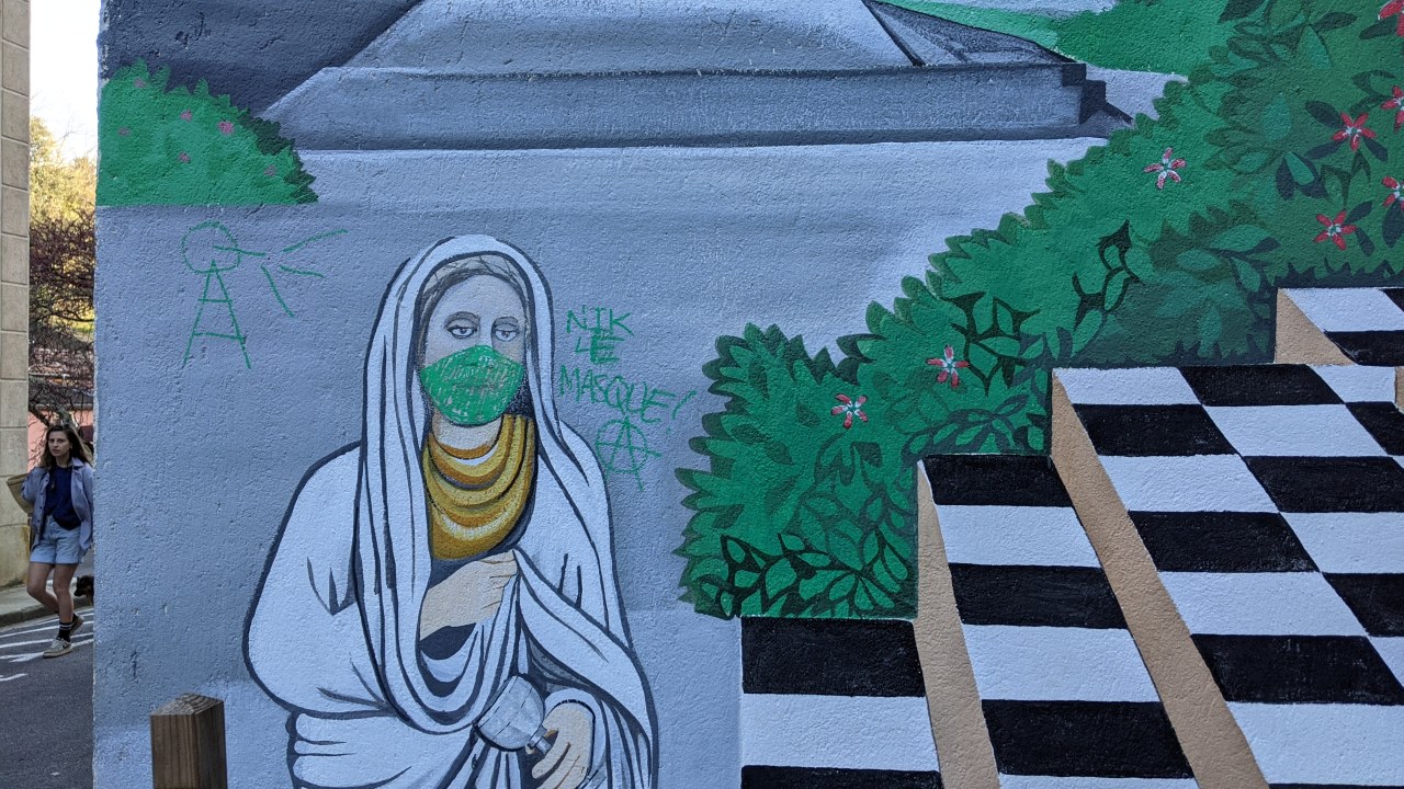 Eine Wandmalerei in Rennes-le-Bains Frankreich. Die Abbildung einer Frau mit weissem altertümlichen Gewand wurde um eine aufgemalte grüne Corona Maske ergänzt.