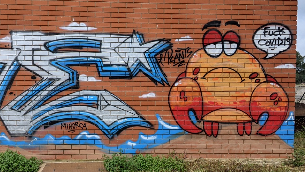April 2021, Frankreich. Ich bin zum zweiten Mal in den Pyrenäen und kann sagen: dort kann man echt ruhige Tage verbringen – ohne die ganze Corona Hysterie. Meist steh ich allein in den Bergen, erkunde die Gegend und gehe viel spazieren. Die Aufnahme zeigt ein zeittypisch verändertes Wandbild.