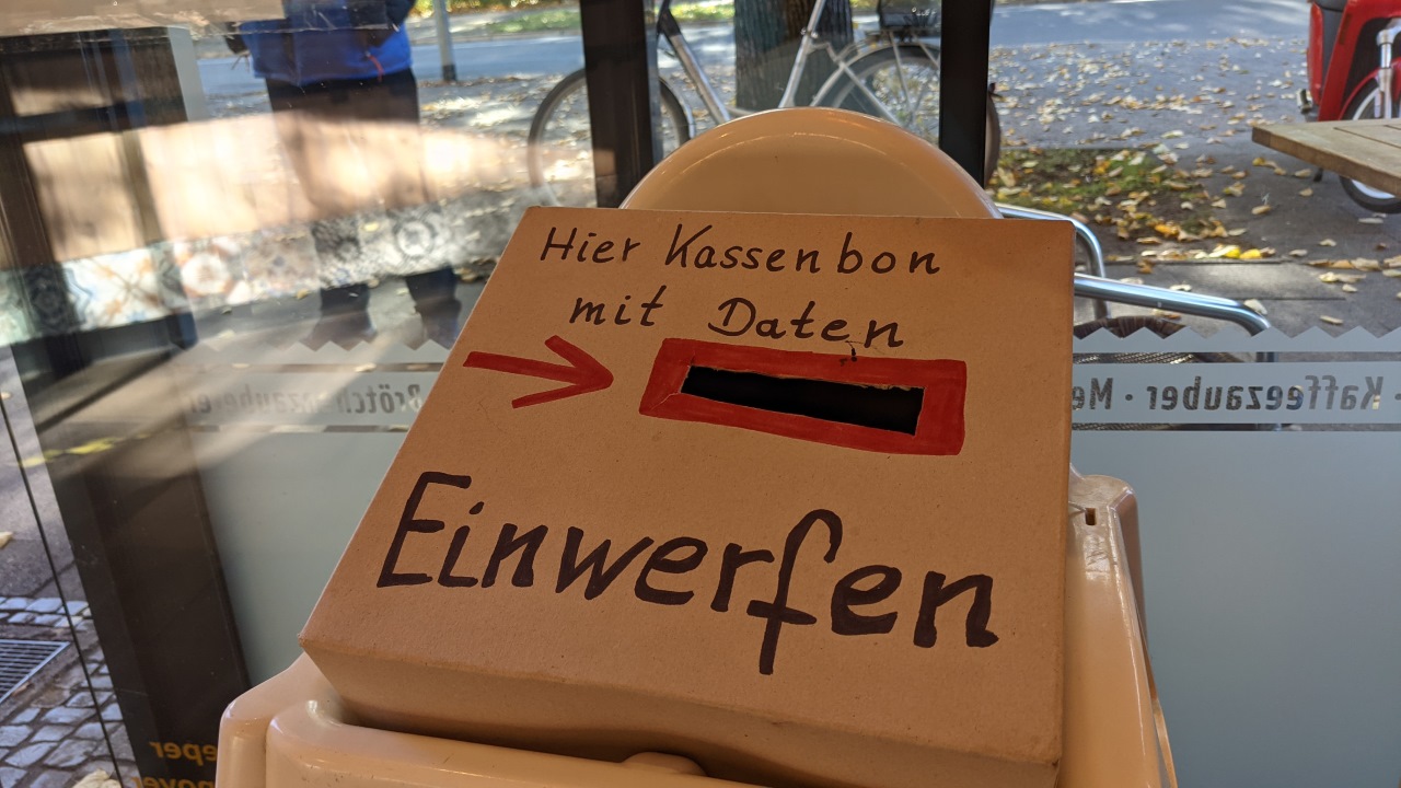 Ein brauner Pappkarton mit Einwurfschlitz beim Bäcker, der mit "hier kassenbon mit Daten einwerfen" beschriftet ist.