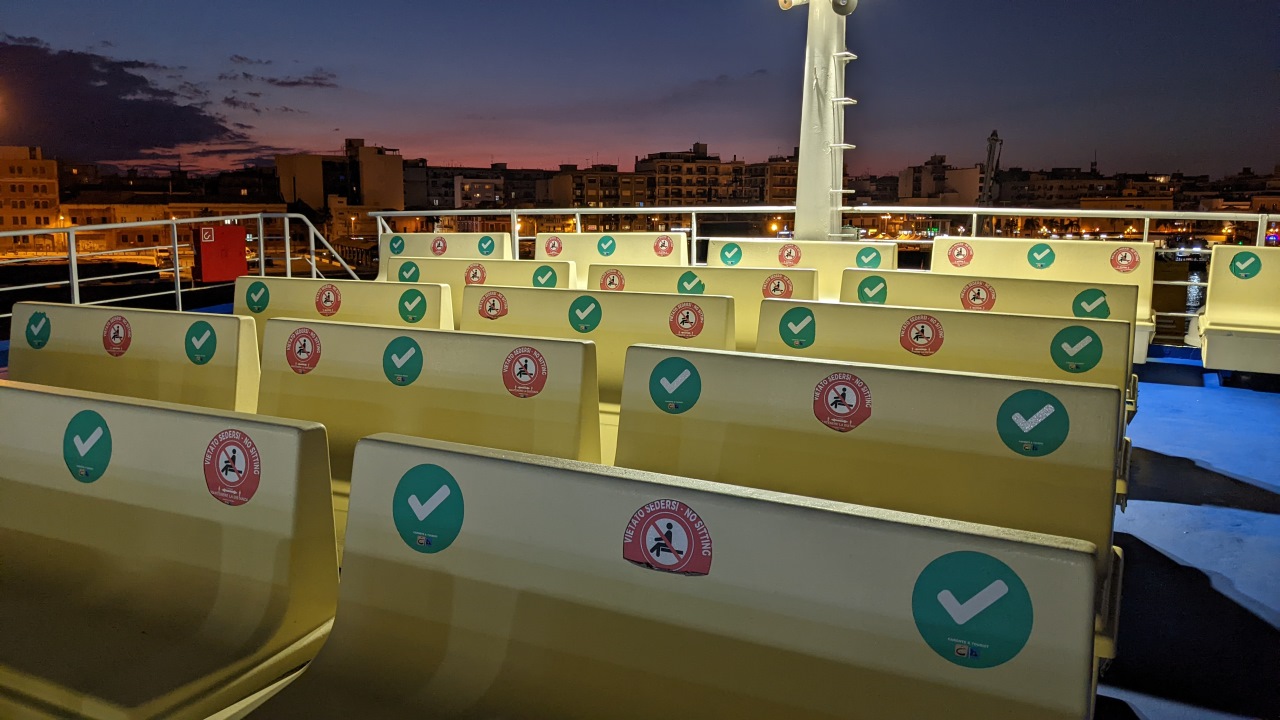 Fotos von Bänken für Passagiere auf einer Fähre. Die Sitze sind abwechselnd mit einen grünen Aufkleber mit OK Haken beklebt und mit einem roten Aufkleber mit einer durchgestrichenen Person.