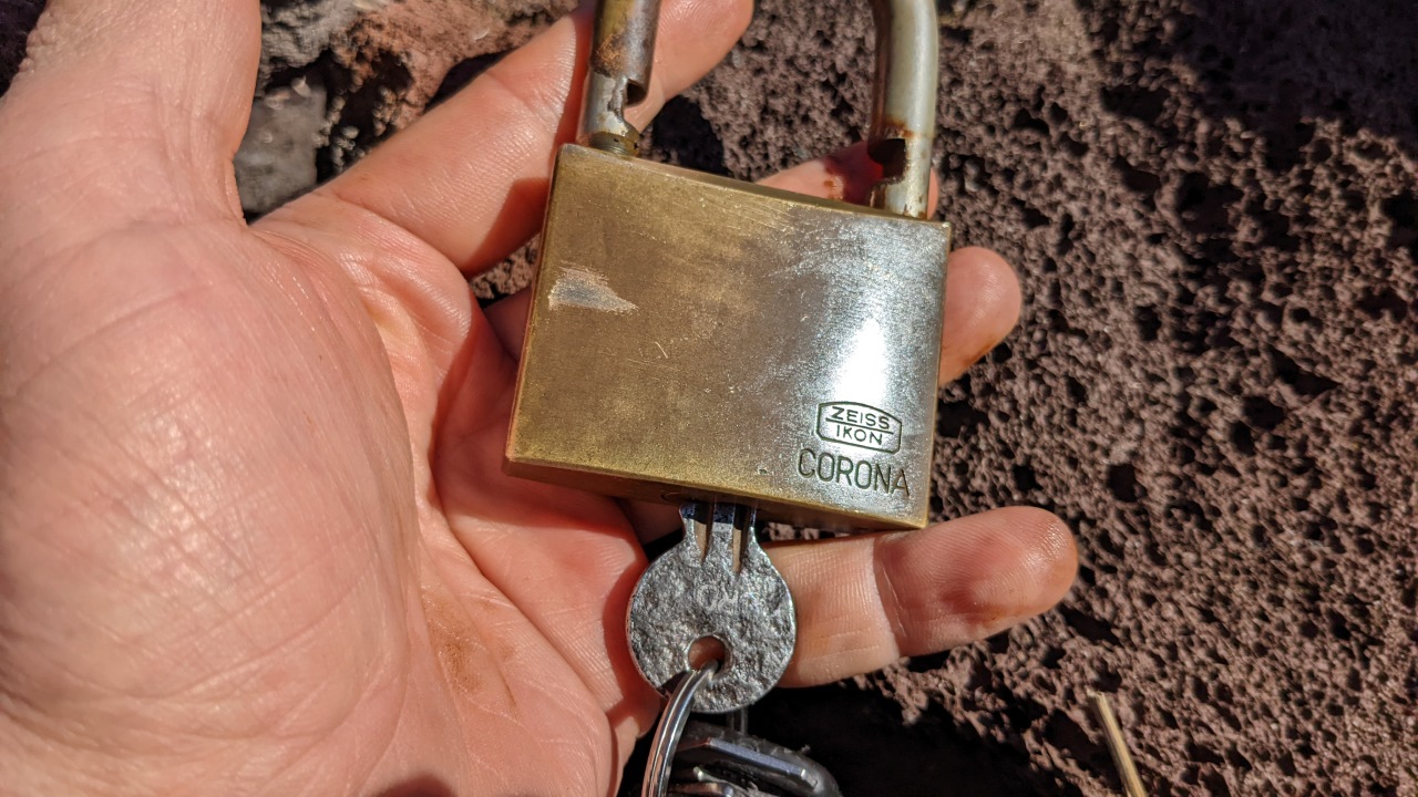 Ich halte ein Vorhängeschloss von Zeiss Ikon in der Hand. Auf dem bronzefarbenen Schliss ist als Marke Corona eingraviert.