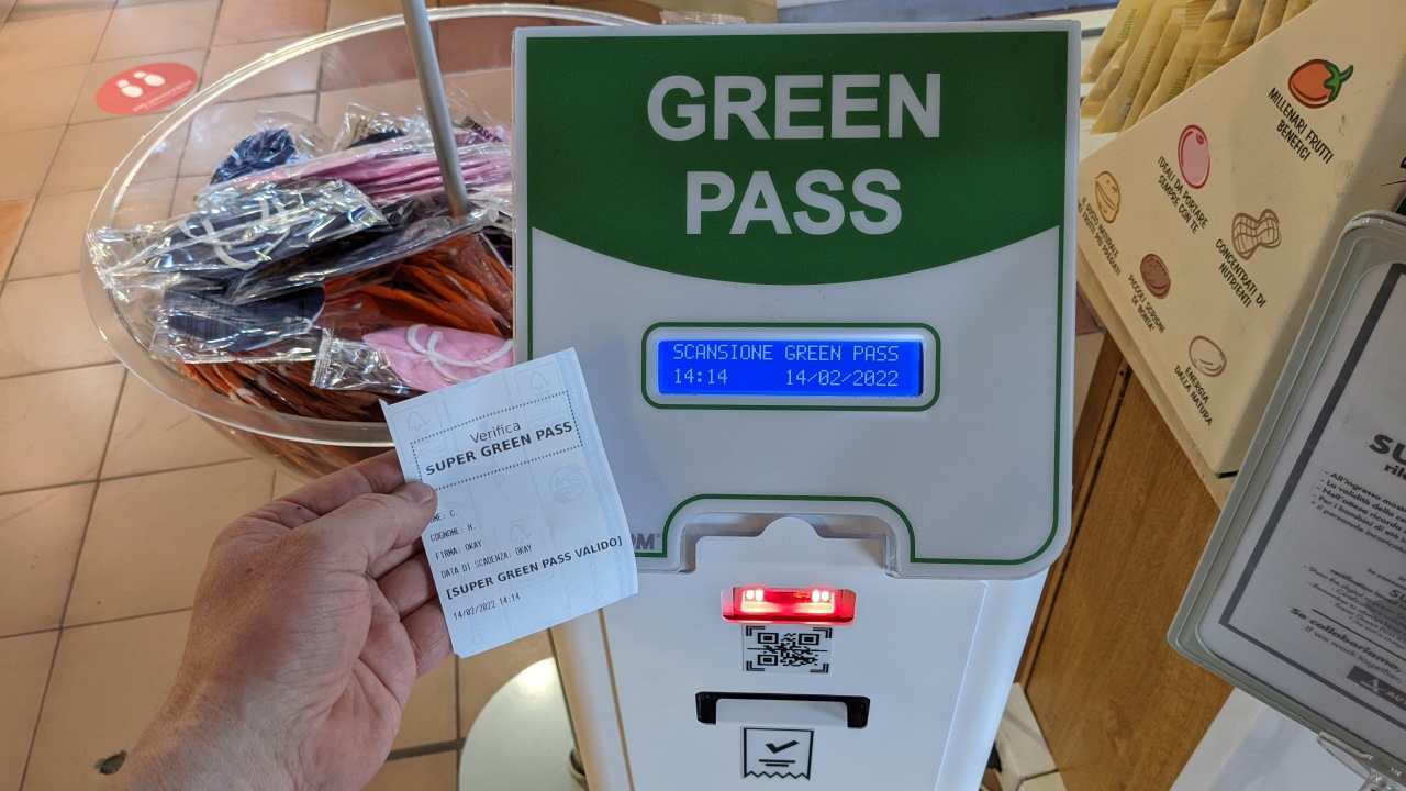 Ein italienischer Automat, der die Green Pass App zur Dokumentation der Corona Impfung auslesen kann und dann einen Papier Beleg druckt. Ich halte einen solchen Beleg ins Bild, vor dem im Hintergrund stehenden Automaten.