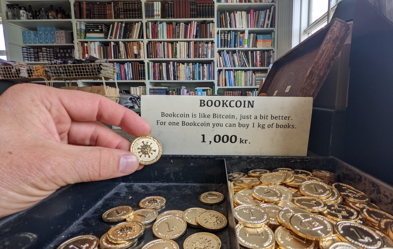 Das muss ich vermutlich etwas erklären. Ich bin gerade in Island. Bei dem Buchladen handelt es sich um die älteste Buchhandlung Islands, die inzwischen in ein Museum umgewandelt wurde. Alte Bücher werden dort nicht pro Stück bezahlt, sondern abgewogen und pro Kilo. Man kann mit Kreditkarte zahlen, in Bar oder mit einer Museumsmünze.