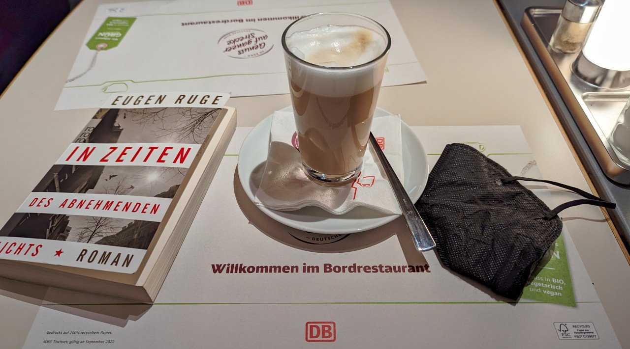 08.11.2022: Der Truck wird nochmals umgebaut, ich bin mit dem ICE auf dem Heimweg nach Hannover. Das Boardrestaurant ist der ideale Platz für Maskenmuffel. Einige meiner Mitreisenden nippen stundenlang an einem einzigen Mineralwasser, ich verbringe die Fahrt mit Chili + Cafe Latte + Lesen. So geht es doch auch, finde ich.