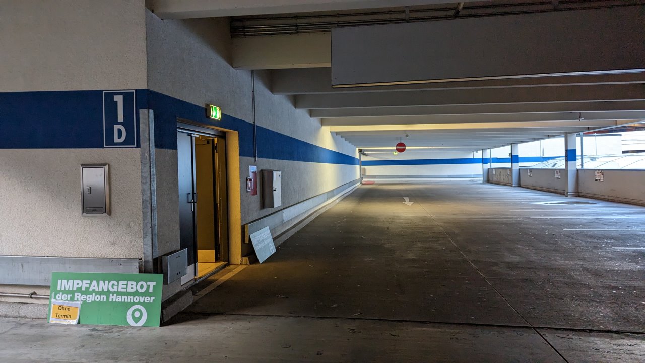 Leeres Parkdeck in Hannover, links ist der Eingang zum Impfzentrum ausgeschildert. Ein grünes Schild weist auf das Impfangebot der Region Hannover hin, ein zusätzlicher Hinweis ergänzt: ohne Termin