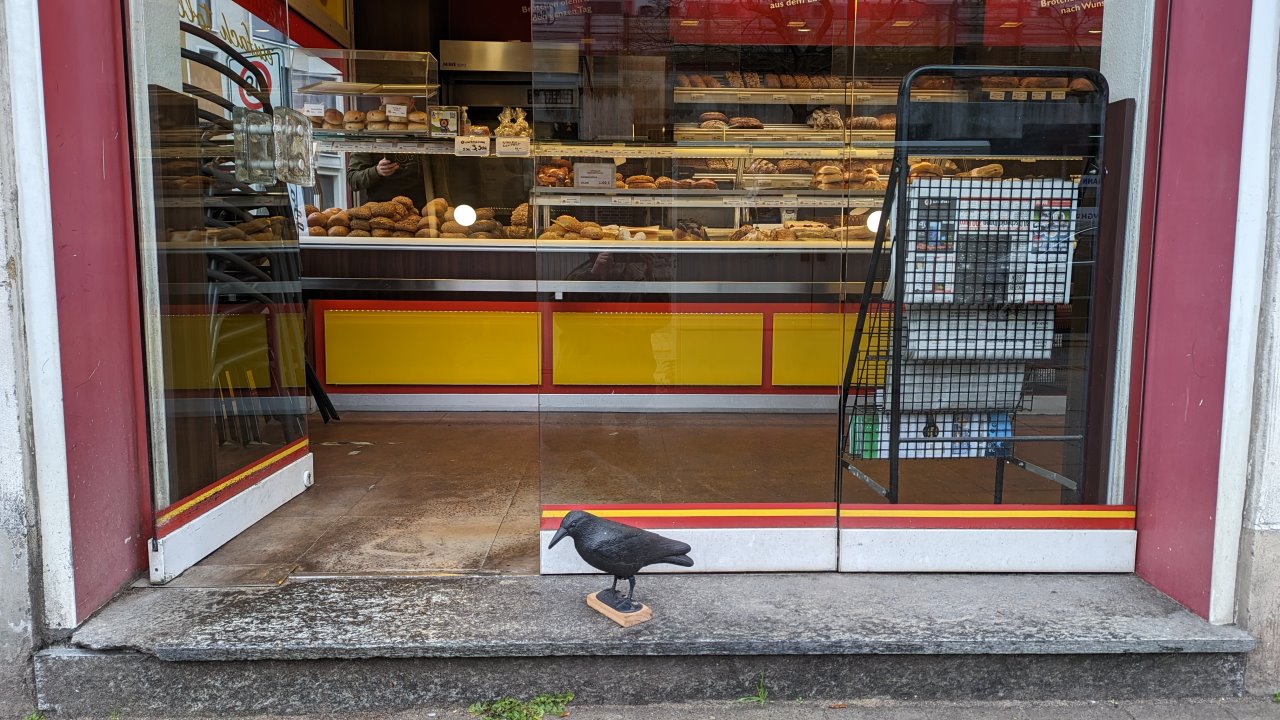 25.11.2022: Irgendwie normalisiert sich alles. Das ist die kleine Bäckerei Filiale, die zur Corona Zeit potentielle Kunden mit Warnungen & Belehrungen eingeschüchtert hat. Weiter oben ist ein Bild davon. Die einschüchternden Plakate sind nun verschwunden. Die Scheiben sind blitz blank und geben endlich wieder den Blick auf das ausliegende Backwerk frei. Vor der Tür steht nun ein Rabe, damit die Leute nicht versehentlich durch die Glasscheibe rennen. Und wegen der Tauben.