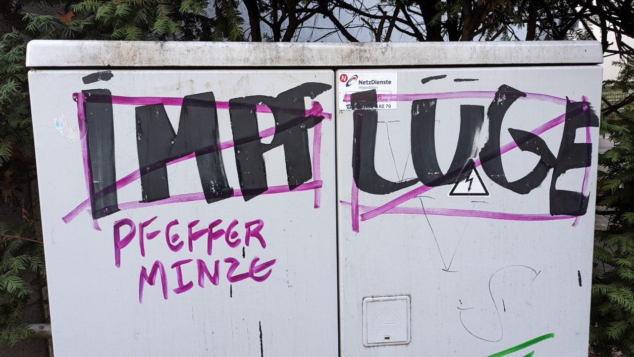 29.01.2023: in Frankfurt. Im Februar fallen die Maskenbeschränkungen im Nahverkehr weg, Corona ist dann im öffentlichen Leben endgültig Geschichte. Corona hat uns fast drei Jahre lang in Atem gehalten – beziehungsweise uns die Luft genommen. Rückblickend ist kaum verständlich, wie so viele Menschen auf die Corona Propaganda der Impfgegner reinfallen konnten. Hier ein obsolet gewordenes Graffiti an einem Stromverteiler.