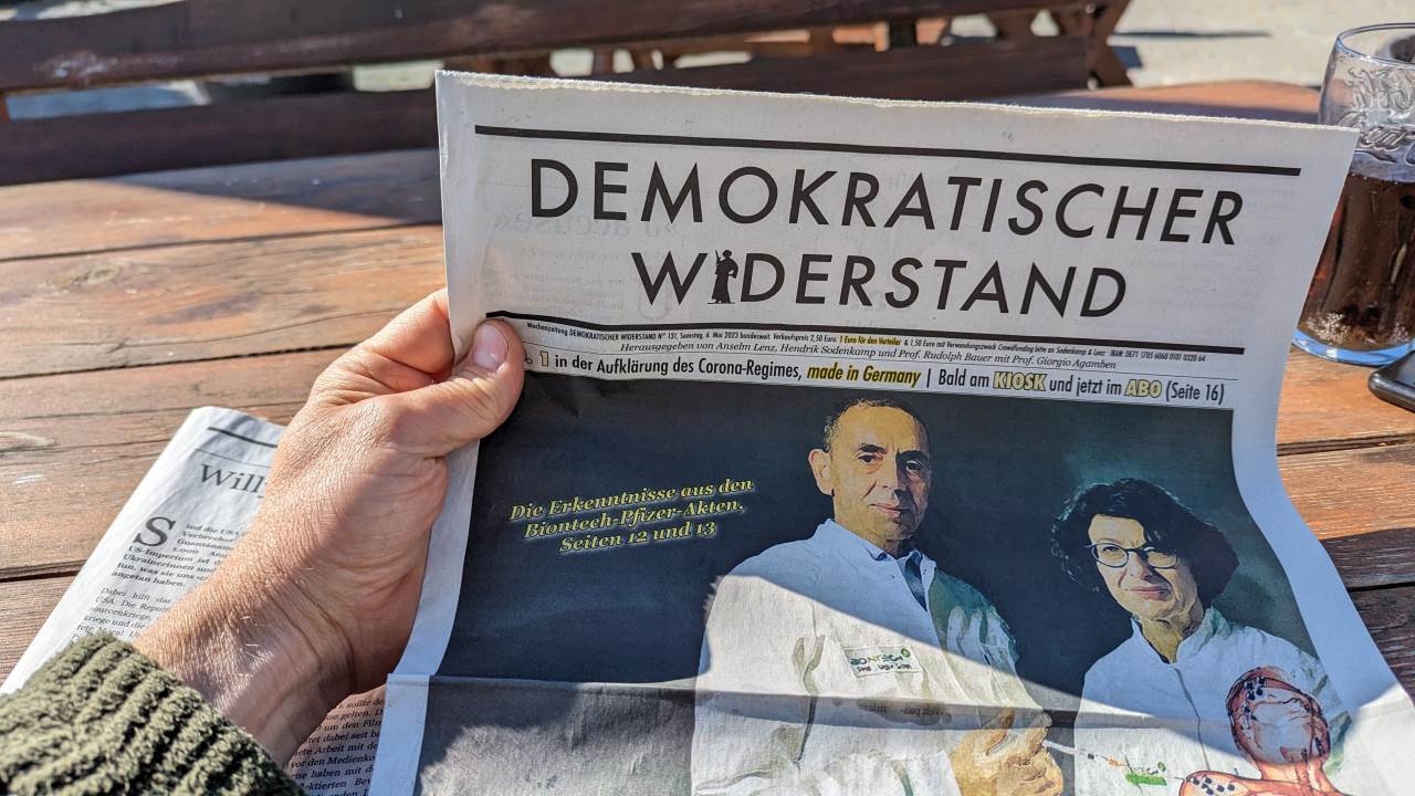 18.05.2023, Stahlbrode: ich bin auf dem Weg Richtung Polen, entlang an der Ostsee. Im Imbiss Hafeneck liegt am Tresen eine dieser Corona Zeitungen mit Verschwörungsmärchen aus. Mit dem üblichen Mechanismus: ein Mensch wird als Feindbild präsentiert.