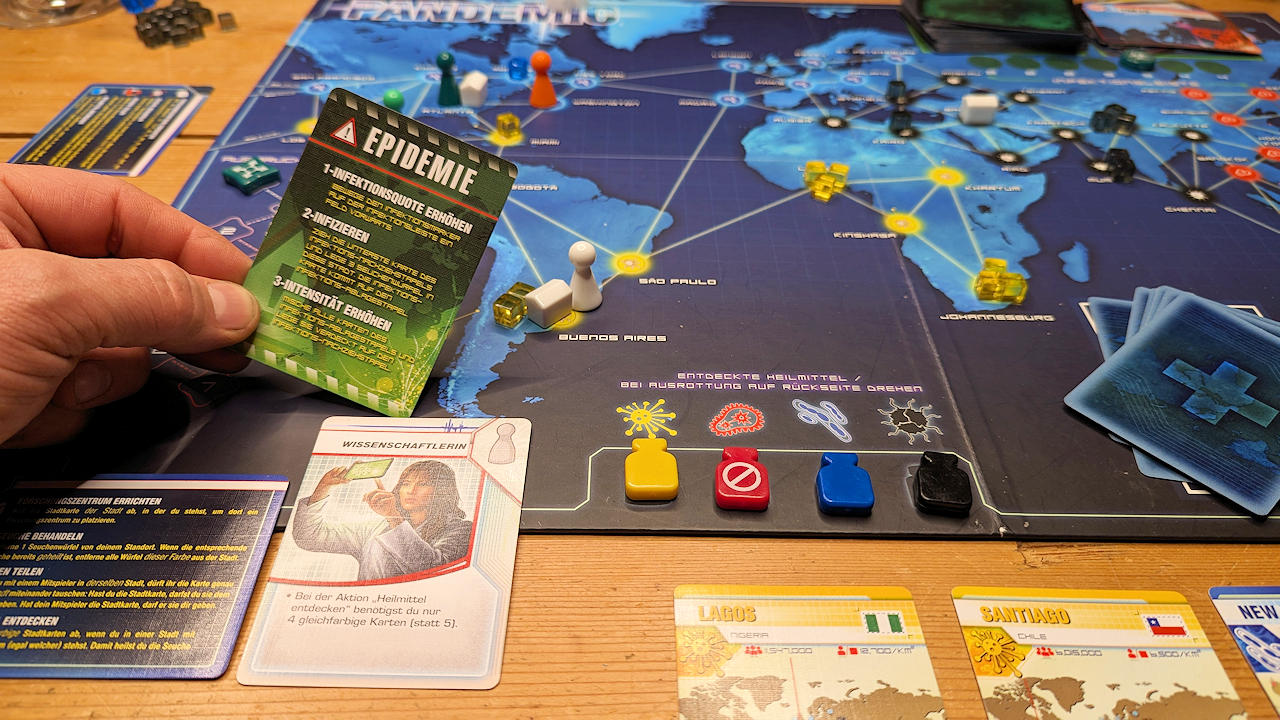 Die Epidemie als Spiel. Zu viert retten wir als Wissenschaftler, Krisenmanager, Sanitäter und Logistiker die Welt und entwickeln Gegenmittel. Kaum jemand erinnert sich noch daran, dass „bis vor kurzem“ Spieleabende und Treffen in Privatwohnungen glattweg verboten waren.