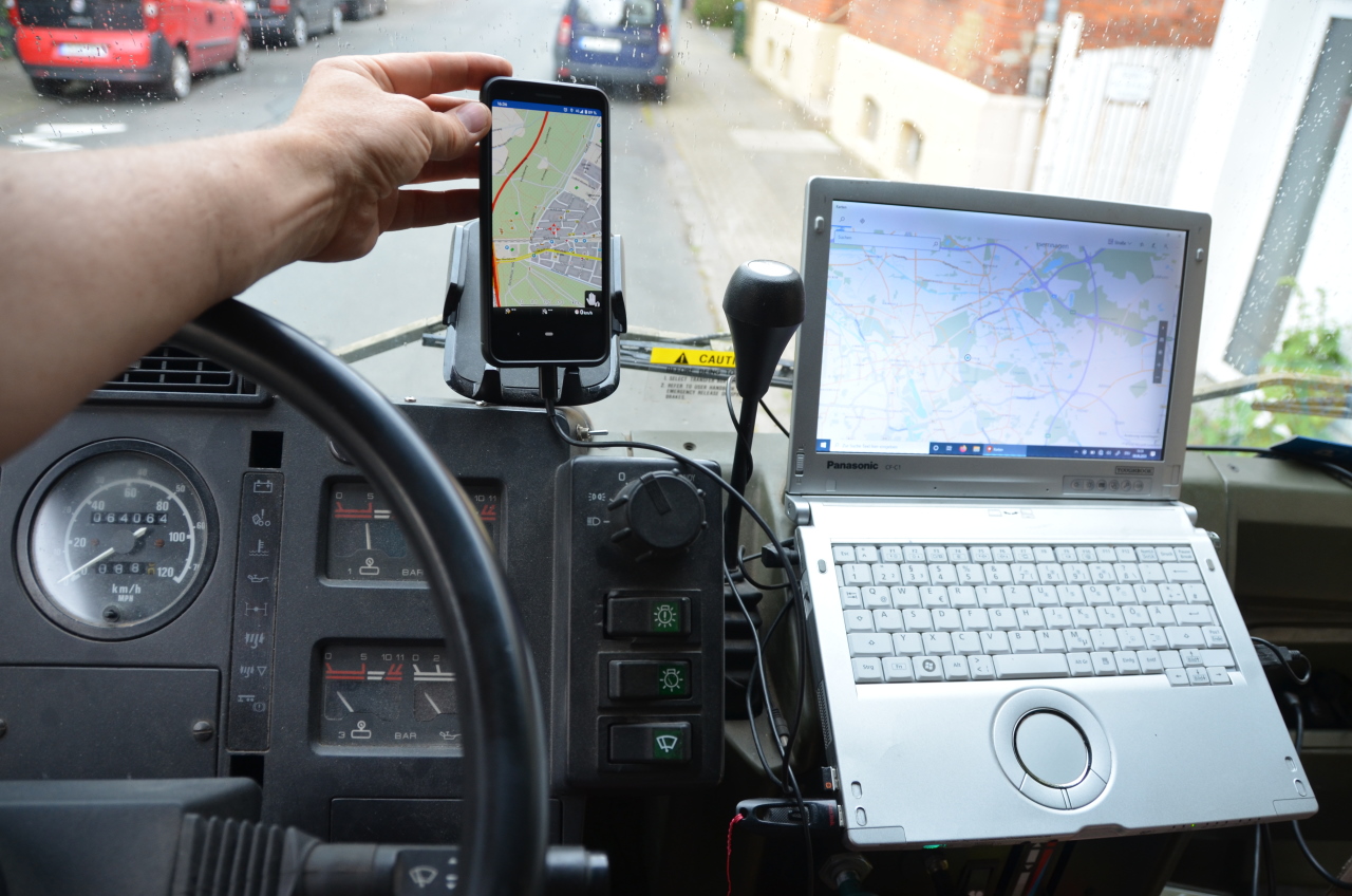 Für mich hat die navigation auf dem Handy den Vorteil, dass ich sie sowohl im Truck, als auch abgesessen unterwegs nutzen kann. Ganz wichtig ist dabei die Möglichkeit, Punkte zu speichern – z.B. den aktuellen Standort vom Truck. Der „Navigator“ läuft daher sowohl auf dem Handy als auch auf dem Notebook. In der Regel lasse ich auf dem Notebook aber die Microsoft Karten laufen. Diese kann man so einstellen, dass sie im Nahbereich als „rolling map“ funktionieren. Damit durchfährt man komplizierte Autobahnabfahrten praktisch aus der Vogelperspektive und wird gleichzeitig vom Handy angeleitet. Man kann aber auch raus zoomen und hat dann Navigation auf dem Handy und eine grosse Übersichtskarte. Die eigene Position ist dann ein wandernder roter Punkt. Für mich ist das so optimal.