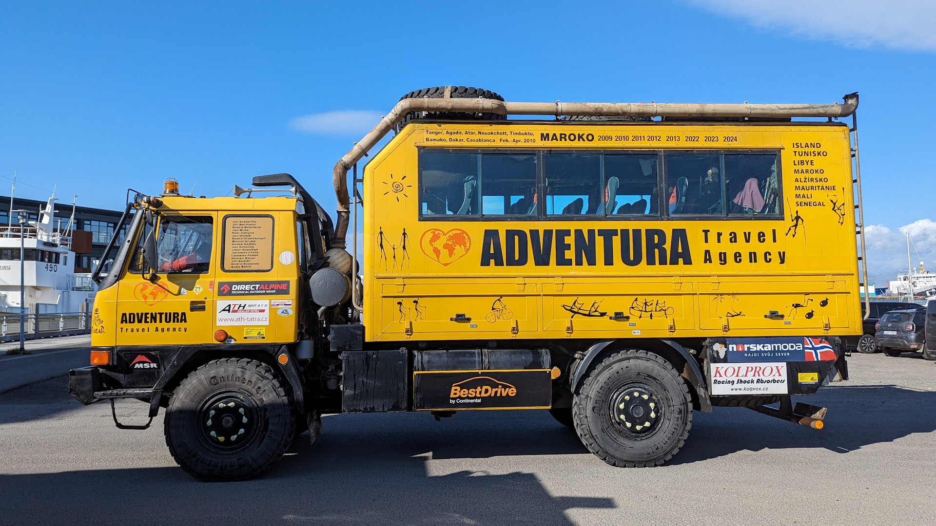 Das Unternehmen Adventura aus Tschechien hat mit diesem zum Camping Bus umgebauten Tatra LKW bis vor kurzem Abenteuer Reisen nach Island angeboten. Der Bus macht Island seit Jahren unsicher und die Fahrer sind für eine absolut rücksichtslose Fahrweise bekannt. Kaum überraschend war der Tatra Bus bereits in mehrere Unfälle verwickelt.