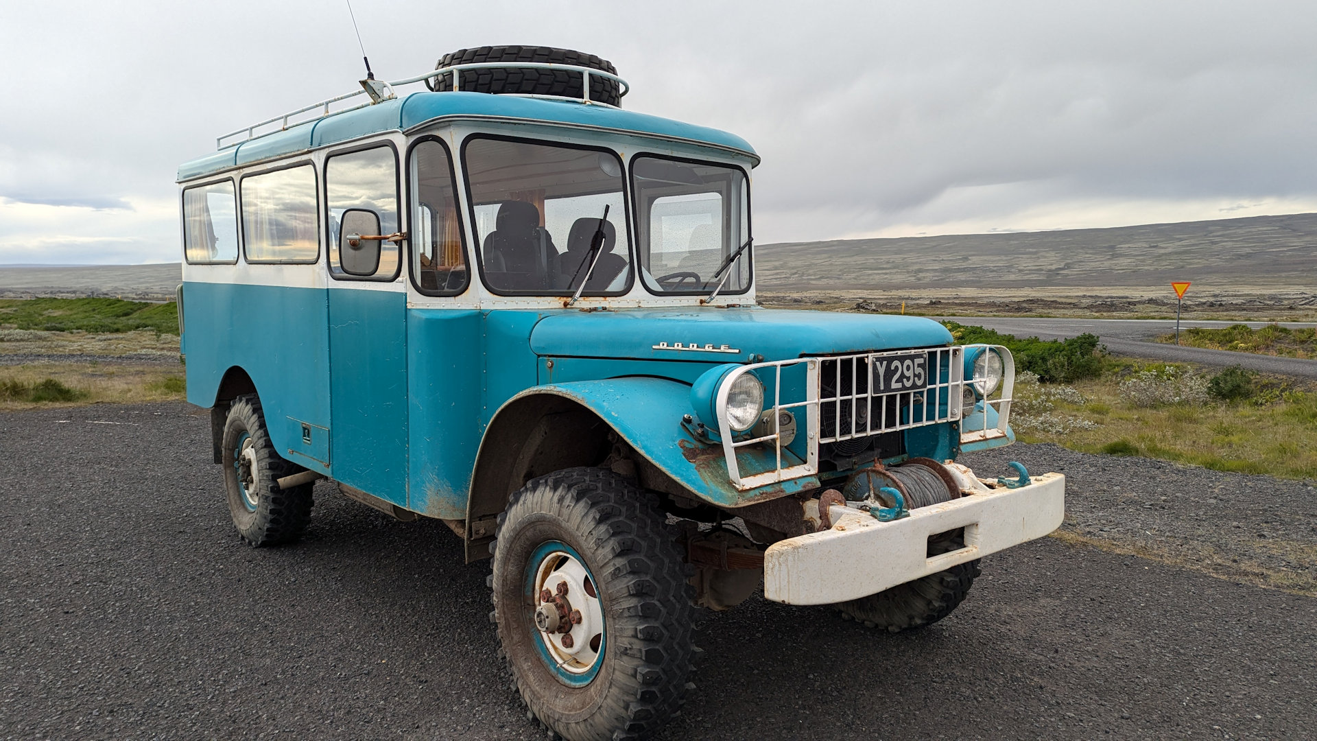 Dieser türkise Geländewagen von Doge war auf den Tag genau 71 Jahre alt, als ich ihn beim Hrauneyar Highland Center an der F26 fotografiert habe.