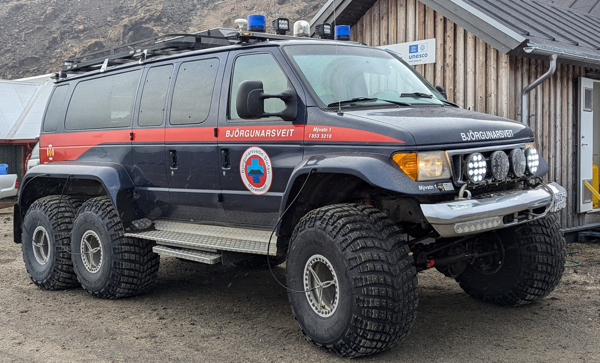 Dann lieber sowas ! Ein himmelblauer Mercedes 4×4 Bus mit rundem Heck. Mercedes G. Mit geändertem Fahrwerk, dicken Puschen, Funk, Schnorchel und Reifendruckregelanlage den isländischen Bedürfnissen angepasst. Ein 6×6 Fahrzeug der Bergrettung in der Askja Dreki Hütte fotografiert. Unbezwingbar ! Im Vergleich dazu ist dieser 6×6 Pinzgauer geradezu niedlich. Das hier müsste der Pinzgauer 718 sein, in der Sanitätsausführung. Eingesetzt vor allem beim Heer in Österreich.