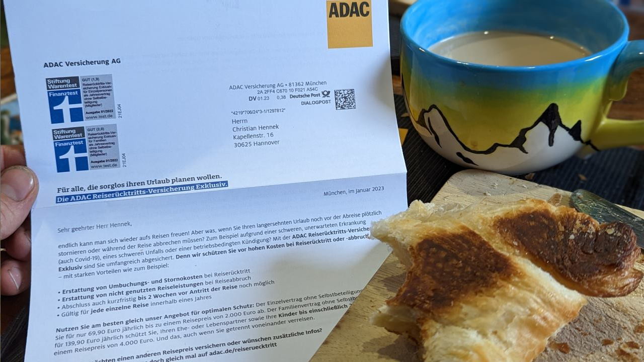 Post am Frühstückstisch. Inhalt sinngemäss: Hallöle Herr Hennek, sie wollen ja anscheinend gar nicht mehr los, wie wäre es mit einer Reiserücktrittsversicherung Exklusiv ? Genau das richtige für sie. Autsch.