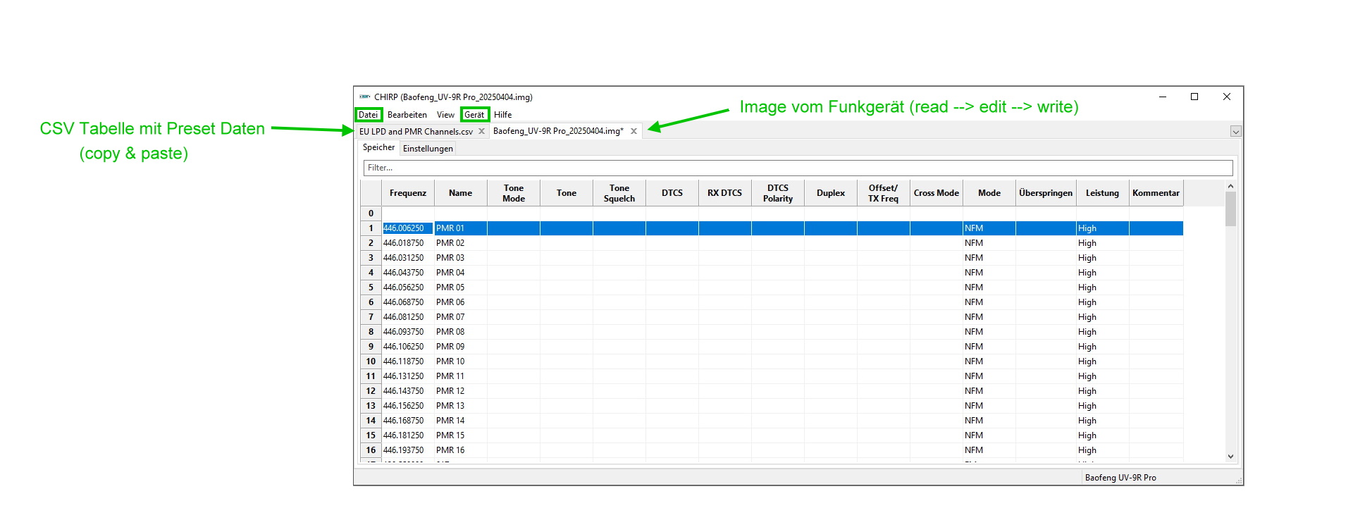 Tipp: ein gut funktionierendes Baofeng auslesen und dann alle Frequenzen mit copy & paste auf ein neues Image übertragen funktioniert auch.