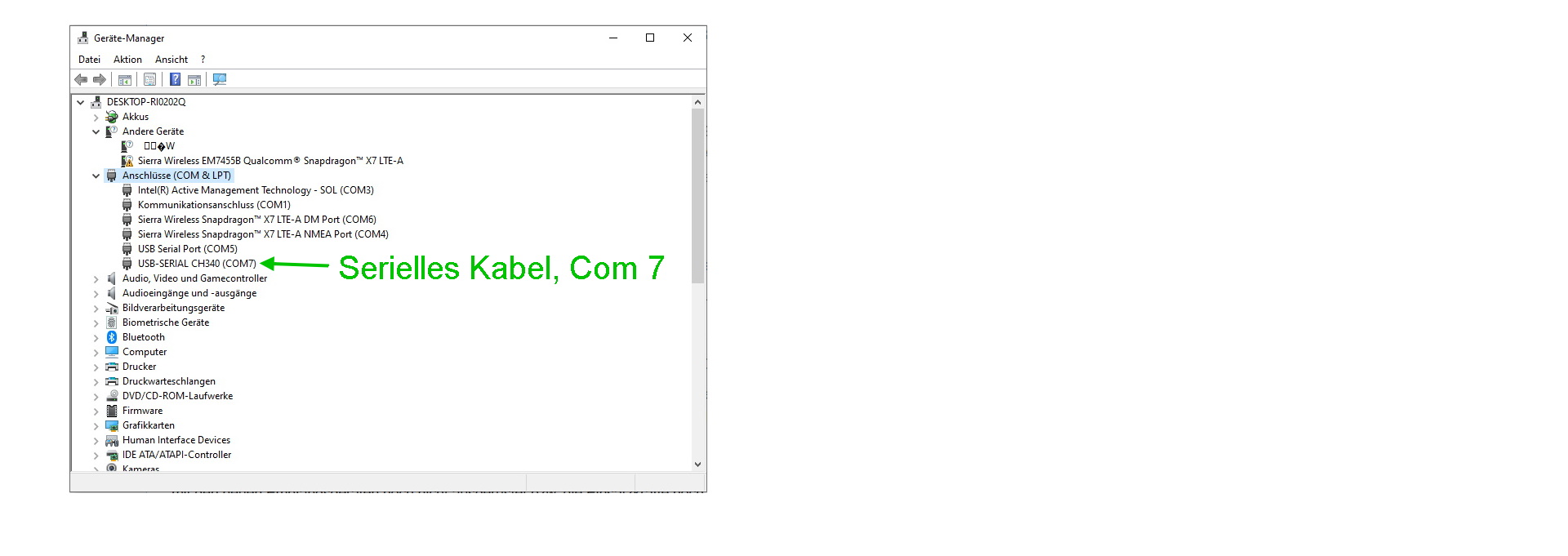 Screenshot Windows Gerätemanager mit hervorgehobenem seriellen Kabel