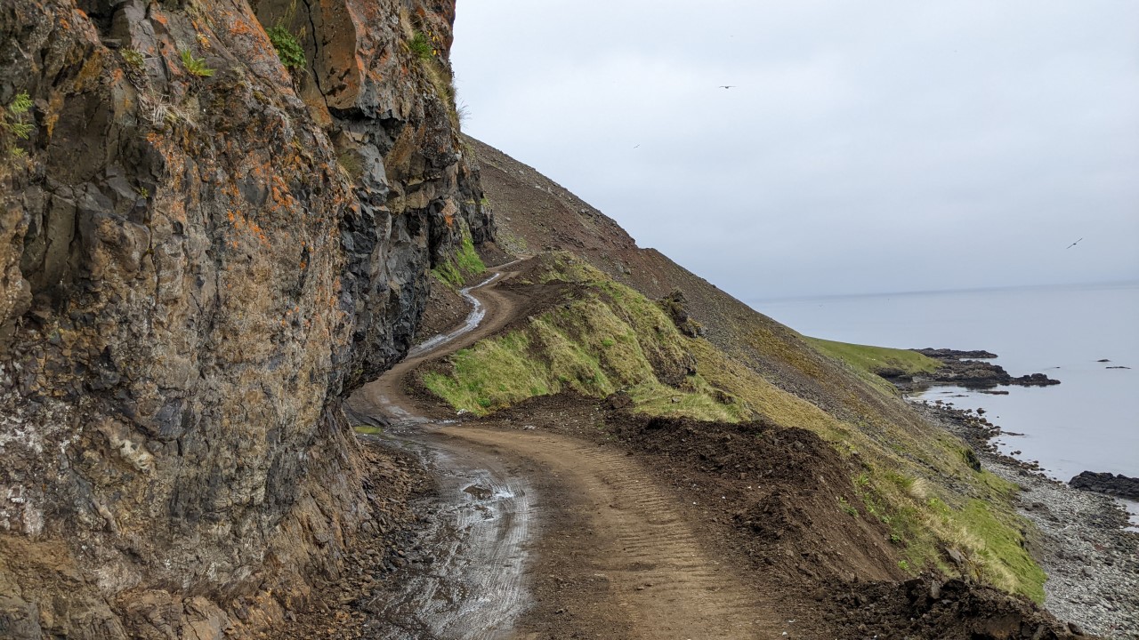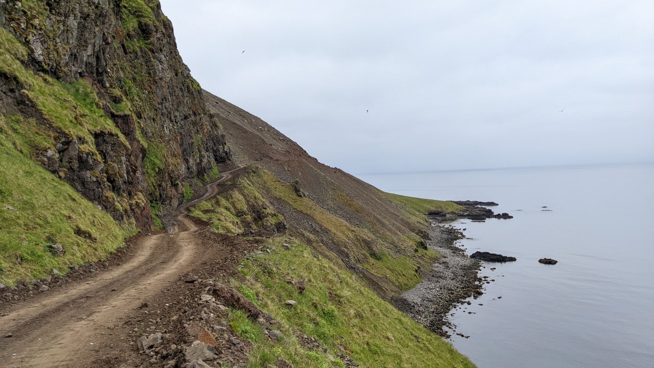 Der Svalvogaleid ist schon recht krass, wenn man ihn nicht gerade zu Fuss abläuft. Eine Piste, die einfach so mit einem Bulldozer in den Berg gekratzt wurde. Zu dem Zeitpunkt war noch alles in Ordnung. Wenn man genau hinsieht entdeckt man, dass etwas nicht fotografiert wurde: der Hebel für die Geländeuntersetzung. Der war zu dem Zeitpunkt nicht mehr oben auf „high“, sondern unten auf „low“. Wie man sieht, geht es da ganz schön runter. Landschaftlich ist die Piste wunderschön, der Weg beginnt in tief eingeschnittenen, grünen Tälern und schlängelt sich dann hoch oben am Hang entlang. Zu dem Zeitpunkt war dann allerdings klar: Felsen, das wird mit dem LKW jetzt ganz schön eng werden.Hier war dann leider für mich Schluss. An der Felsnase links wäre ich nicht vorbei gekommen. Rechts ausweichen nicht unbegrenzt möglich. Dort war alles schon etwas weggebrochen und sah bröselig aus. Schlecht mit 7,5 Tonnen. Dahinter kam noch eine weitere etwas blöde Ecke. Das war dann der Moment, in dem ich Rückwärts (!) dort wieder rausgefahren bin, schön vorsichtig. Was eine Weile gedauert hat. Ich hab ziemlich gebraucht, um eine ausreichend grosse PKW Ausweichbucht zu erreichen, in der ich den Truck dann in 15 Zügen oder so mit Blick über dem Abgrund gewendet hab.