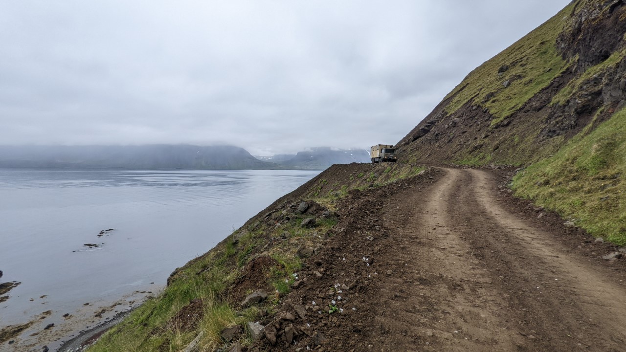 Mit einem Geländewagen (schmaler und nicht so hoch) wäre die Svalvogaleid glaube ich sehr gut zu machen. Der DAF hat als ursprünglicher 10-Tonner einen Radstand von 4 Metern, was das enge umkurven von Felsnasen leider etwas kniffelig gestalten kann. Trost: dafür sind die Langzeit Reisequalitäten exzellent.