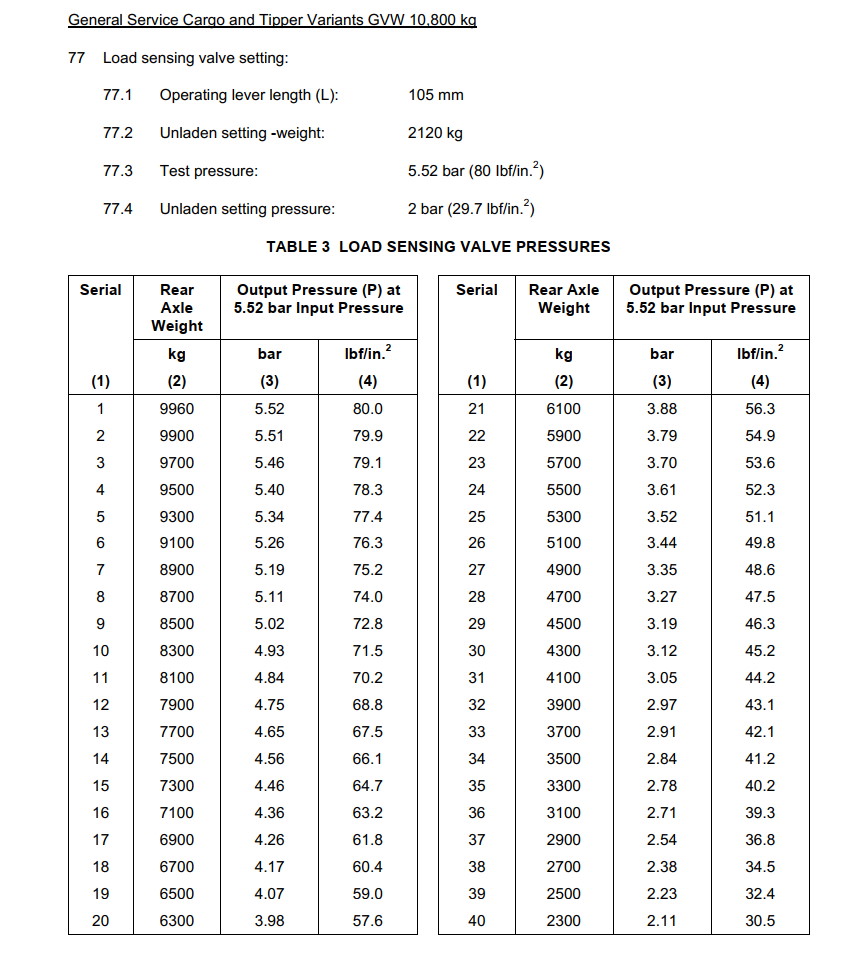 Die Tabelle gibt an, welcher Druck am Prüfanschluss anliegen muss. Abhängig von der Last auf der Hinterachse.