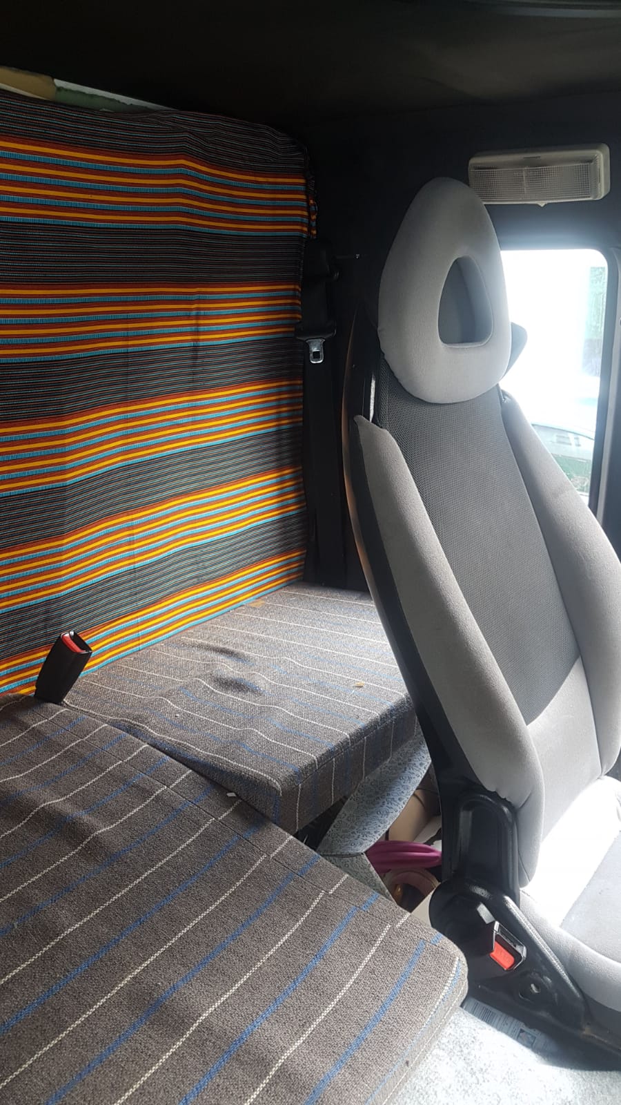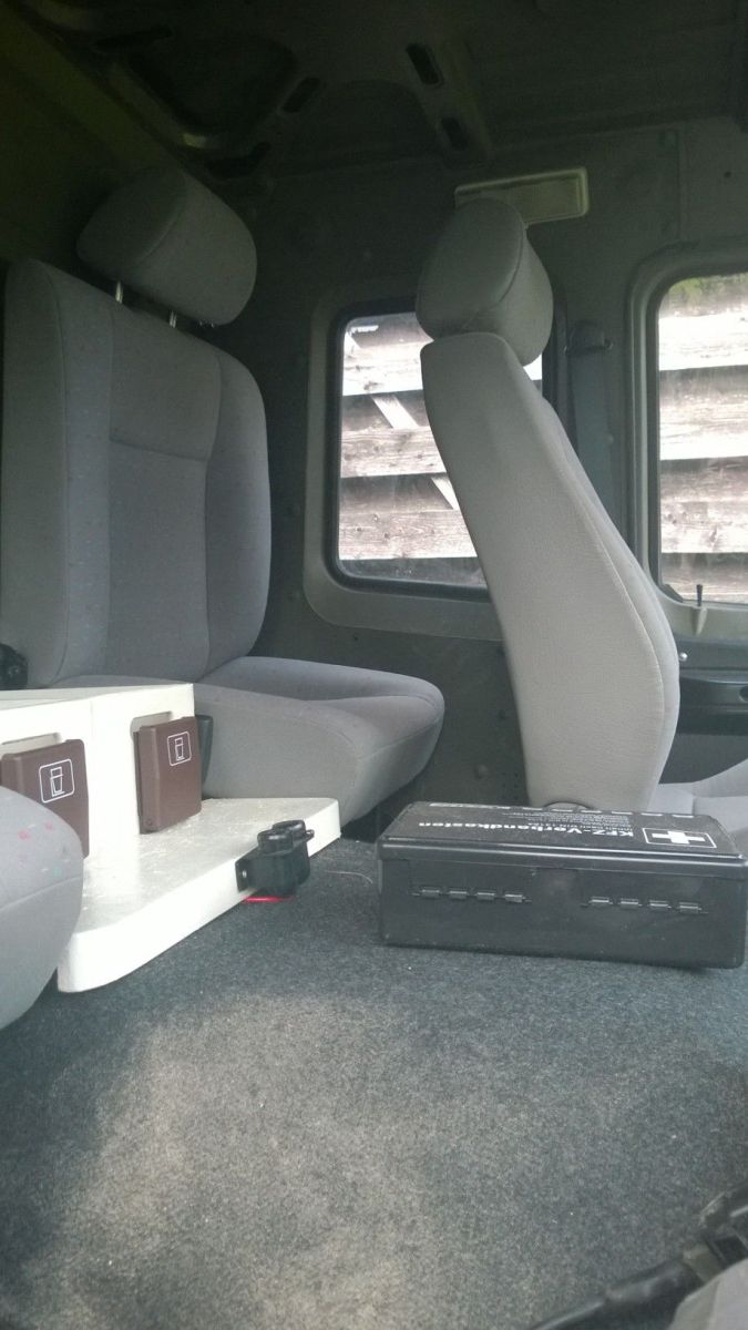Als Beifahrersitz wurde ein Fahrersitz verbaut. Dieser ist leicht nach links versetzt, so dass der Notsitz in der Mitte nicht mehr passt. Dafür ist er aber nach vorne verschiebbar und schafft Platz für einen weiteren Sitz mit vergleichsweise viel Beinfreiheit. Eine optimale Lösung für drei Erwachsene, wenn der Beifahrer etwas nach vorne rutscht. Es kann mit dem Blick in den Seitenspiegel dann aber knapp werden. (Bildrechte: Maik Schüler)Zwei Sitze, ungekannter Hersteller. (Bildrechte: Malte Knaust)Optimale Lösung mit Smart Sitzen, zwei Erwachsene, zwei Kinder plus Gepäck passen gut ins Führerhaus. (Bildrechte: Malte Knaust)Bis zu vier Sitze mit ausgebauter Mittelkonsole bei diesem DAF T244. (Bildrechte: Petra Ludewig)Eine sehr farbenfrohe Lösung, aber wegen der fehlenden Sitze wird es keine offizielle Eintragung geben. Ich find diese Lösung trotzdem interessant, weil so eine prima Liege entstanden ist. Ideal, wenn man längere Strecken auf der Autobahn mit müde werdenden Kindern unterwegs ist oder Nachts durchfahren möchte. (Bildrechte: Eddy Freiburg)