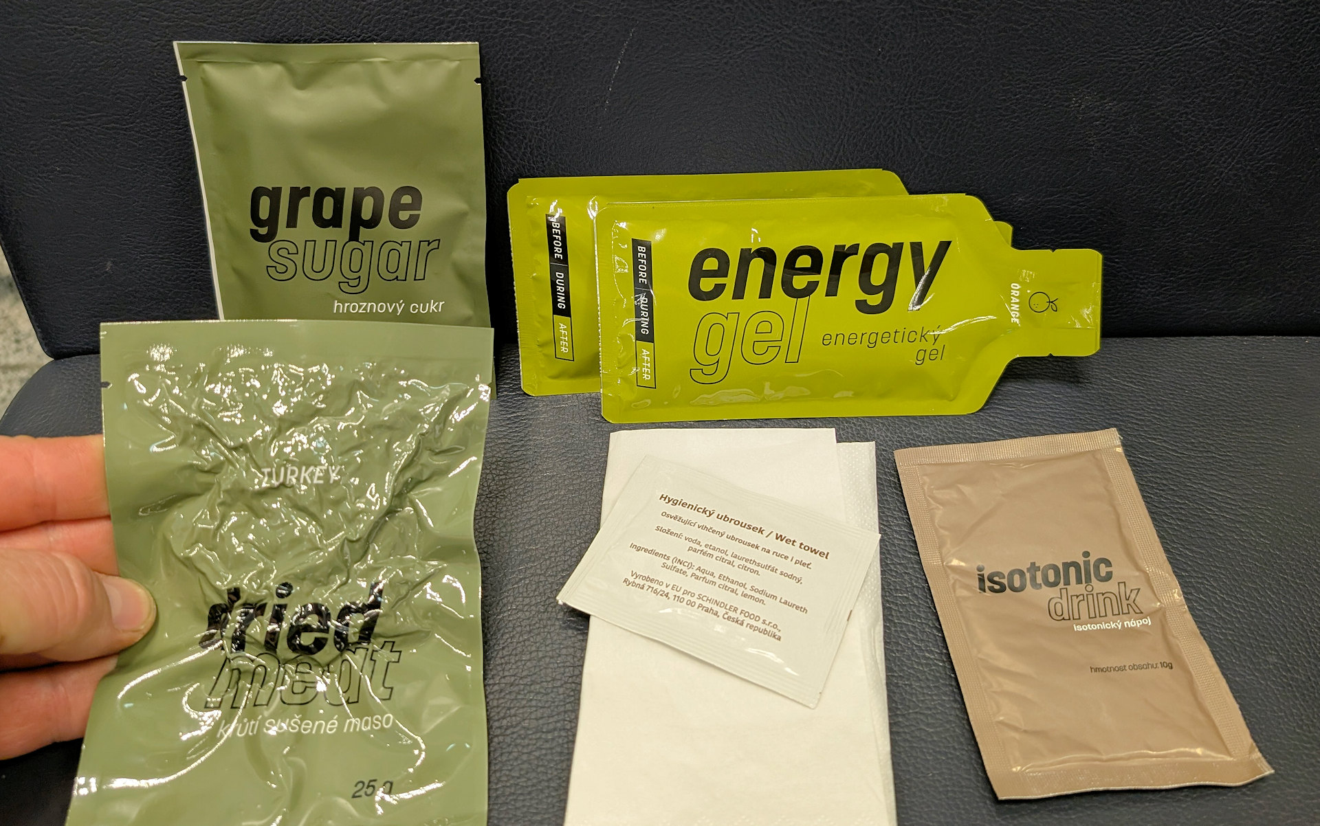 Auf dem Energy Gel steht „Orange“ drauf, es schmeckt aber nach nix. So auch das Getränkepulver, was einen eher seifig schmeckenden Trunk ergeben hat. Die angegebenen 600ml erreicht man damit niemals. Das getrocknete Fleisch war extrem trocken, an dem hat man durchaus eine weile zu kauen.