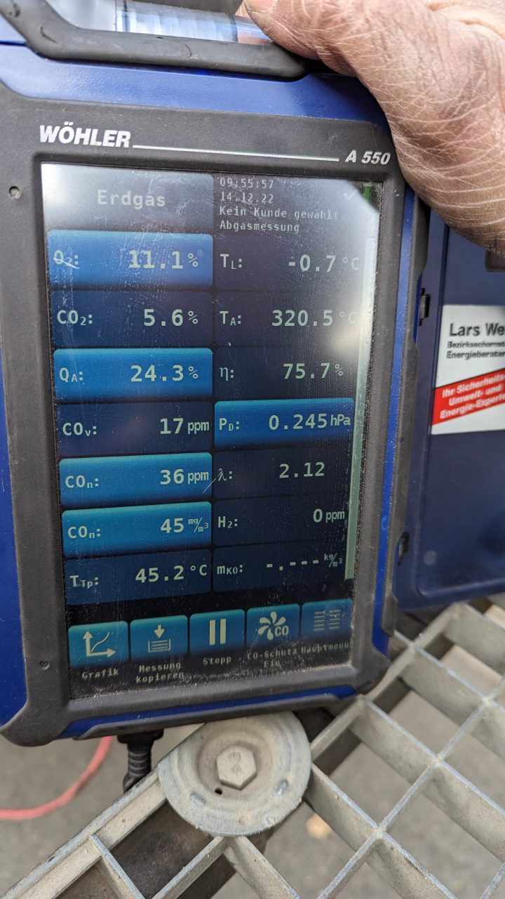Die Abgastemperatur fand er zu hoch, wenn die Heizung startet ist sie nicht effizient genug und haut zu viel Abwärme raus. Die Abgaswerte wie Co2, Co und so weiter fand er okay.