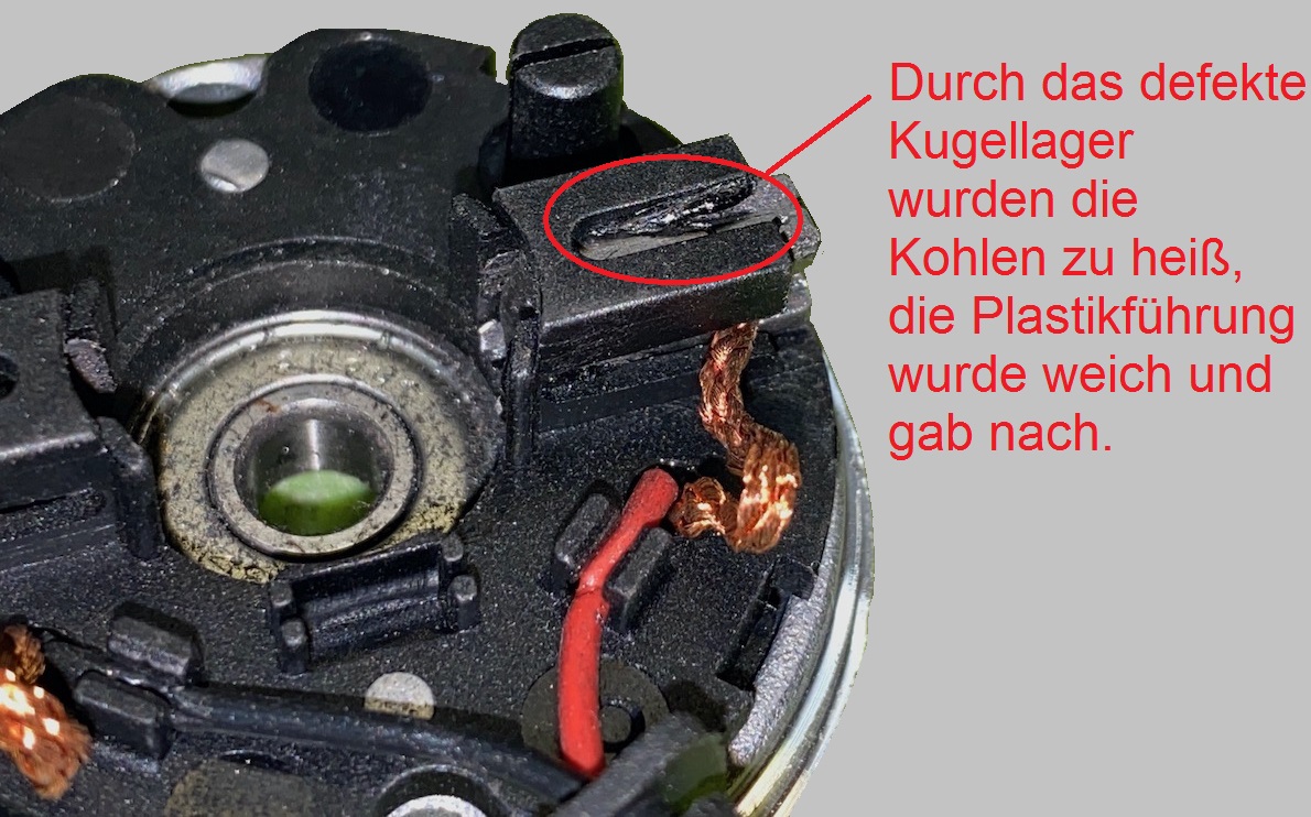 Der Kunststoffkorpus für die Kohlen scheint robust zu sein, muß dennoch mit Vorsicht vom Aluteil getrennt werden, da dieser durch 2 leicht gestauchte Führungsstifte in exakter Position gehalten wird. Darunter sitzt ein Kugellager.