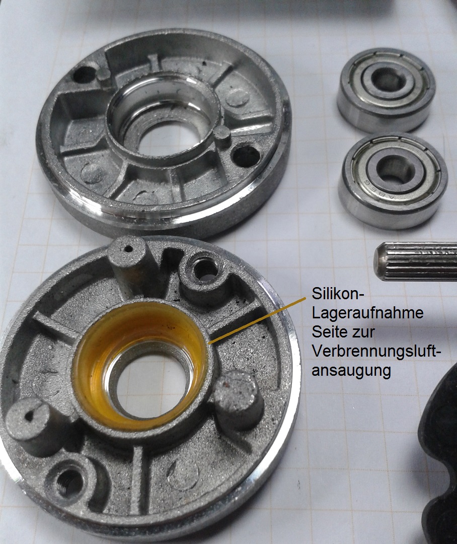 War auch genau dort leicht angerostet. Ich dachte schon, daß das Lager dort gefressen hatte. Ich schob das neue Lager darüber -ganz schön wackelig, zu viel Spiel. Ich fixierte das neue Lager mit 2K an der Welle