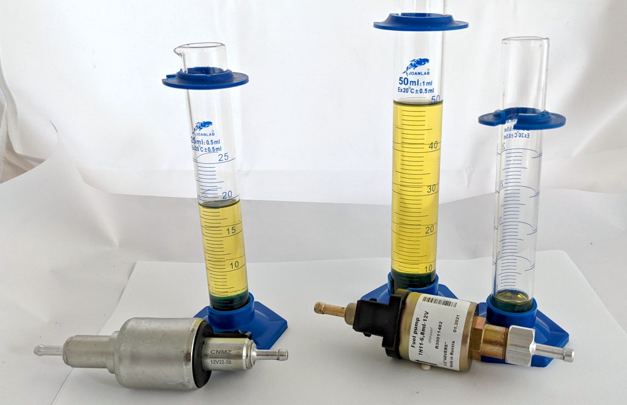 Die Planar Pumpe, die mit 6,8 beschriftet ist fördert wesentlich mehr. Ich hab pro Zyklus 55ml gemessen. Hochgerechnet auf 1000 clicks wären das 62 ml, das könnte in etwa mit den 6,8 hinkommen. Die Russen geben die Leistung daher offenbar in Milliliter / 100 clicks an. Das sind die zwei Röhrchen rechts auf dem Bild. Gleicher Zyklus, ca 2,5 Mal höhere Fördermenge.