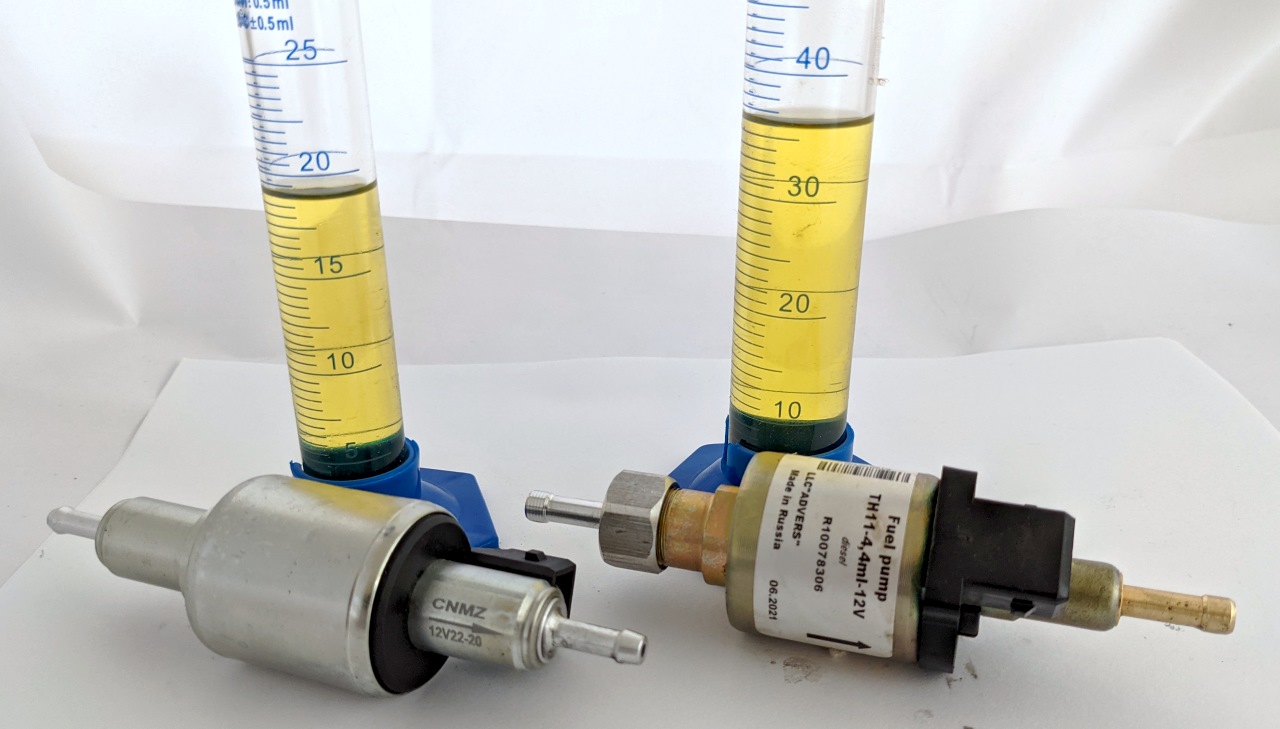 Tigerexped hat diesen Typ Pumpe auch mit kleinerer Leistung (4,4 ml) im Programm, außerdem in 12 Volt und 24 Volt Varianten. Fraglich wäre, ob sich die gute Pumpe aus Russland für die guten Heizungen aus China adaptieren lassen bzw welche Änderungen an den Einstellungen (Drehzahl, Takt der Pumpe) dafür notwendig sind.