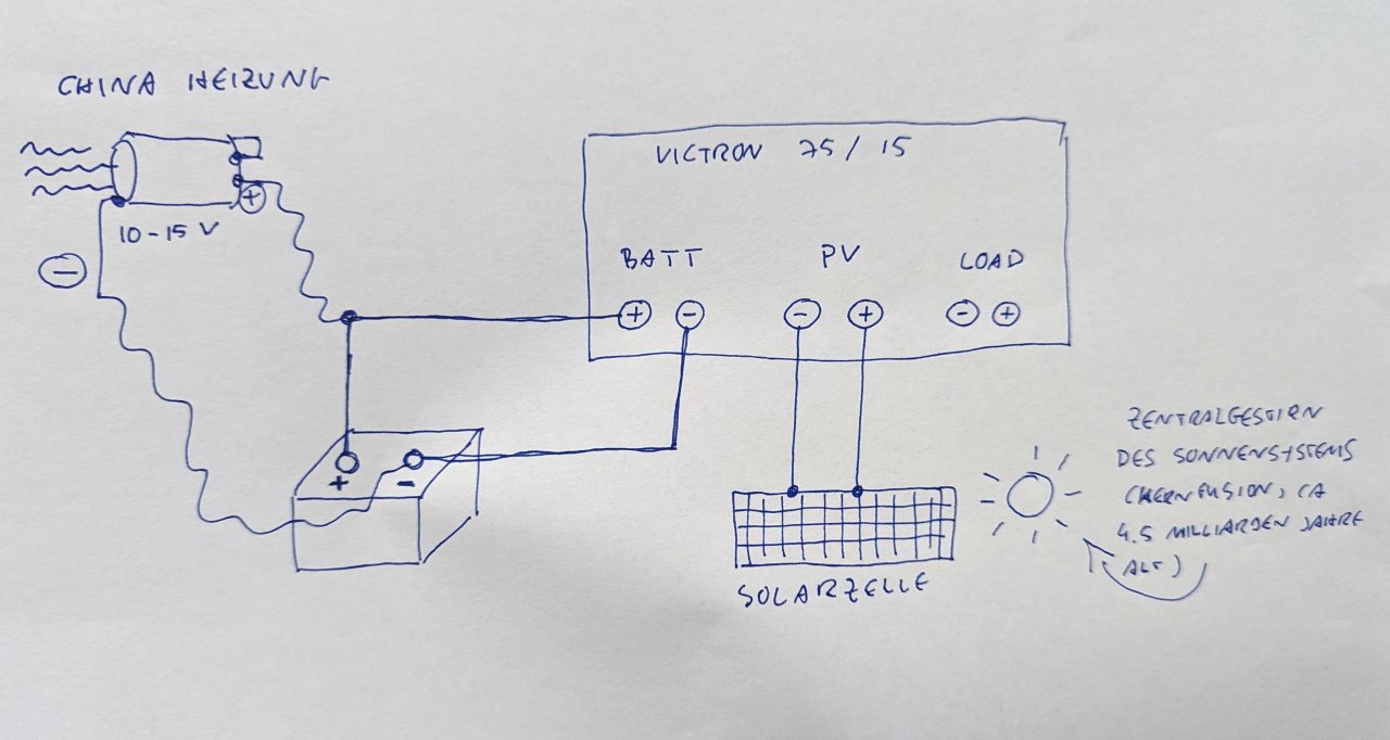 Und nun zum Laderegler: dieser wendet einige Tricks an, um die Batt bestens zu laden. Einer davon ist , abhängig von der einfließenden tatsächlichen Sonnenenergie, in Zeitabständen die Spannung auf ein Maximum anzuheben. Da wären wir bei der Überspannung, die der Heizung Probeme bereitet. Deine Heizung ist für ein Auto gebaut. Dort haben wir eine Batteriespannung von 12,5Volt, und wenn der Motor an ist, liefert die Lichtmaschine max. 14,2Volt. Das ist fast die obere Grenze, der Chinaheizer. LiION nimmt 14,4V und LiFePO4 14,6V.