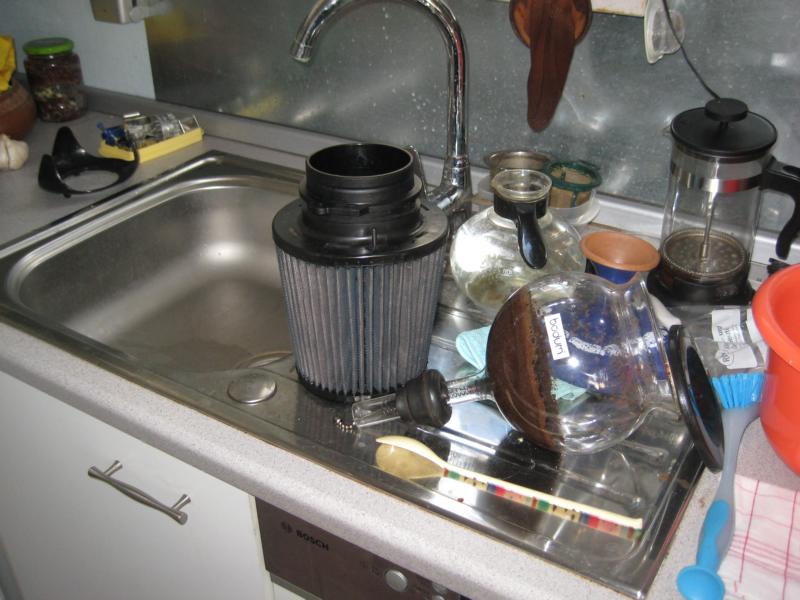 das ding erstmal (in der küchenspüle- frau kam, fragte "schatz, was machst du da?- luftfilter waschen- aah, oki". ich liebe sie) gewaschen, anschließend getrocknet.