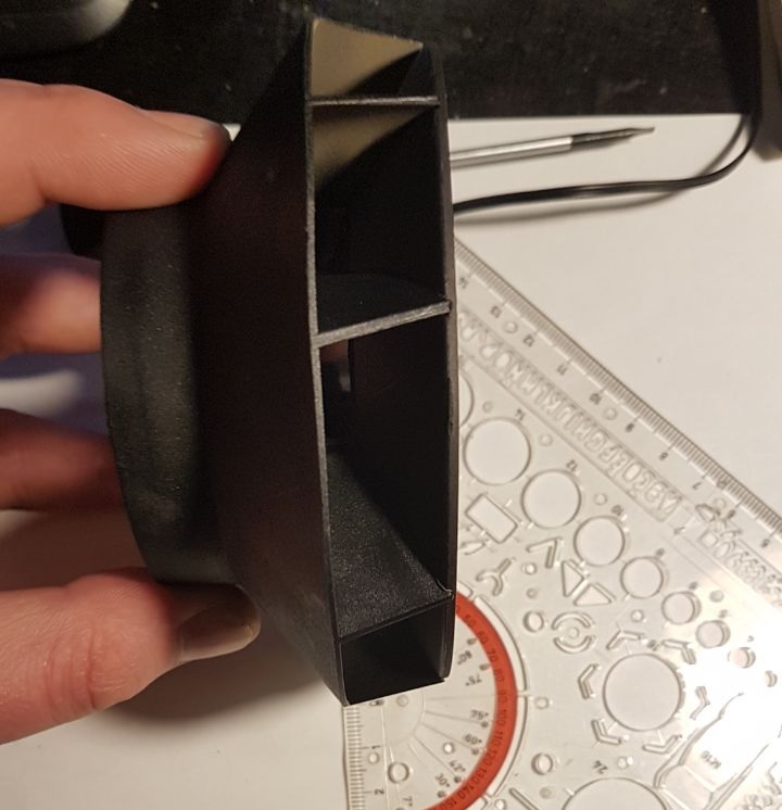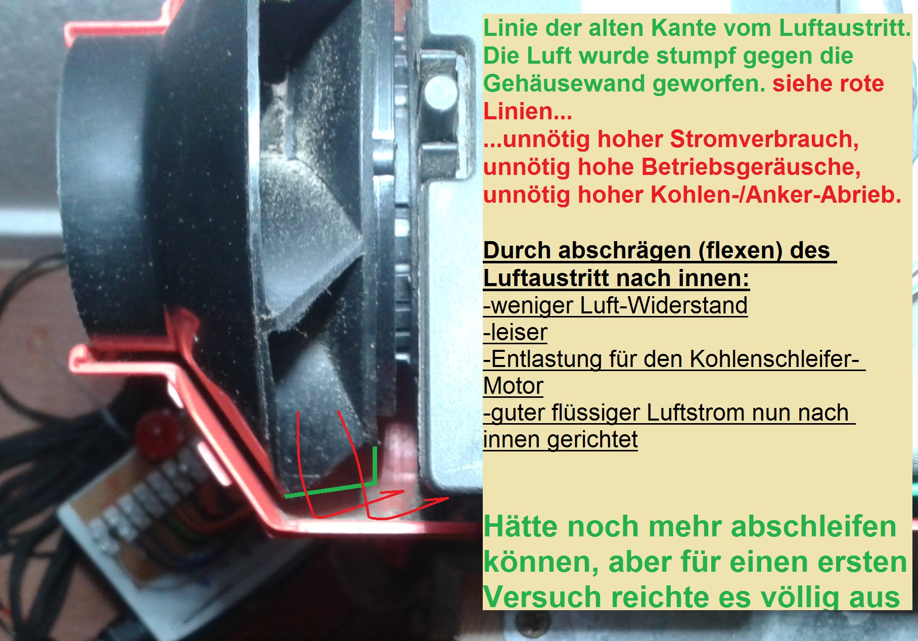 grundsätzlich gut gedacht. ABER, die luft wird bei all diesen Geräten im stumpfen Winkel gegen die Gehäusewand geschleudert und muß dann nach vorne abgelenkt werden. Durch mein Abschleifen teilt sich die Luftmasse besser. Das Huiii... wird ein wenig leichter...