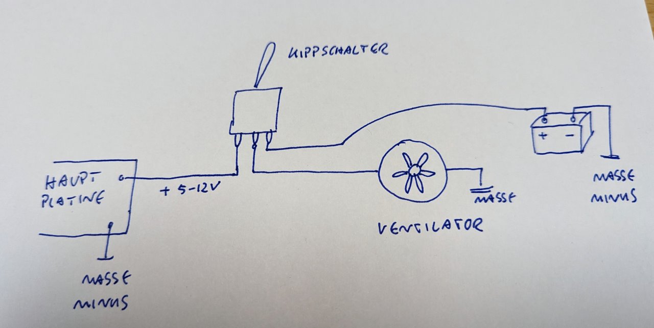 ich hätte da so eine Idee, bin aber nicht überzeugt. Du könntest das rote Kabel vom Lüfter auftrennen und mit einem Kippschalter versehen. Das mittlere Kabel beim Kippschalter geht zum Lüfter. Einer der äusseren Pins geht zur Hauplatine (Ursprungszustand) der andere äussere Pin geht auf 12 Volt (Ventilator an).