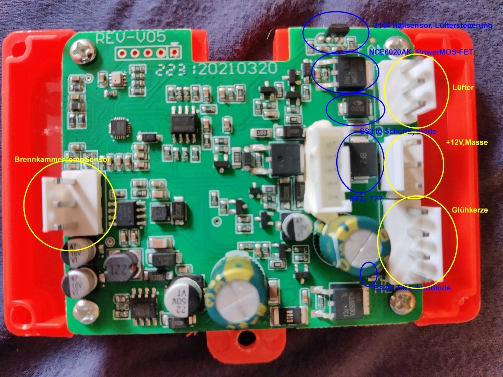 Q1: Hat den Sensor schon mal jemand identifiziert, kann man den auslöten und extern legen ? Ich finde auf der Leiterplatte zumindest kein "verdächtiges Bauteil, das aussieht wie ein Temp-Sensor; (Platinenbild siehe unten, GELB=Stecker, BLAU=2-3pol. Bauteile)