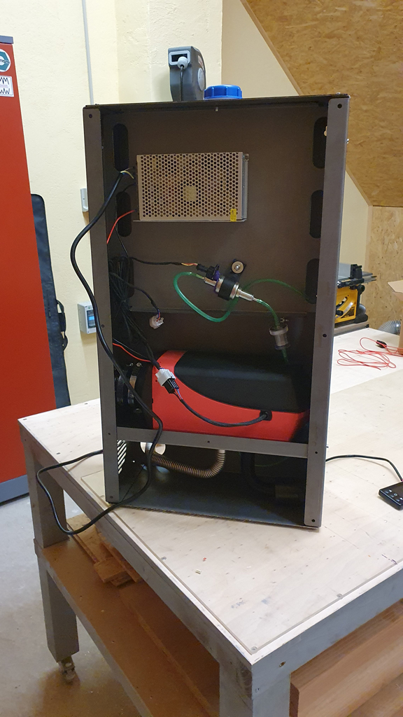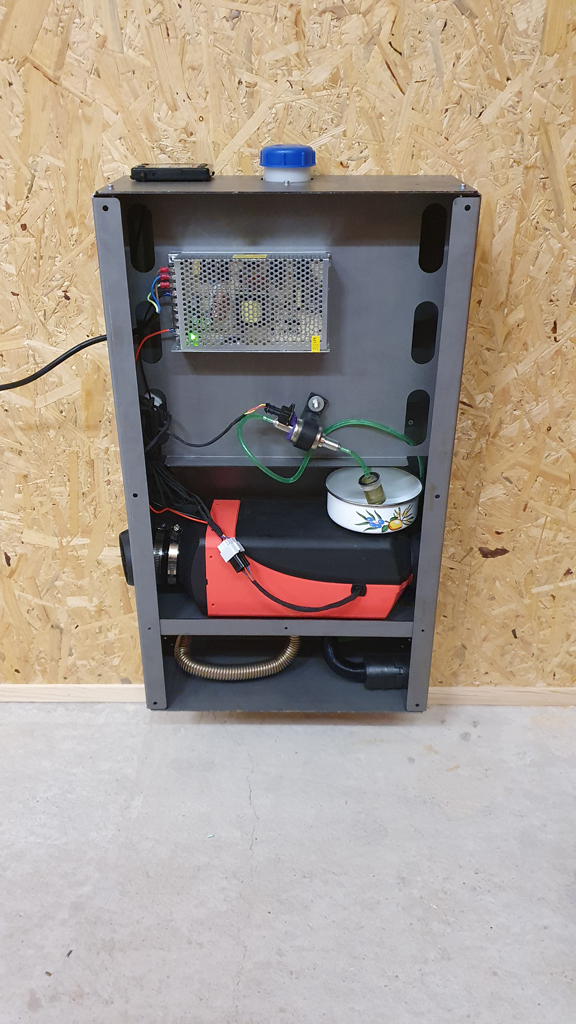 Ich habe mir für die Heizung in der Werkstatt ein Gehäuse konstruiert, in dem ich alles eingebaut habe. Mittlerweile hängt das Gehäuse an der Werkstattwand und die Abgase werden durch einen selbstgebauten Edelstahlauspuff durch die Wand geführt.
